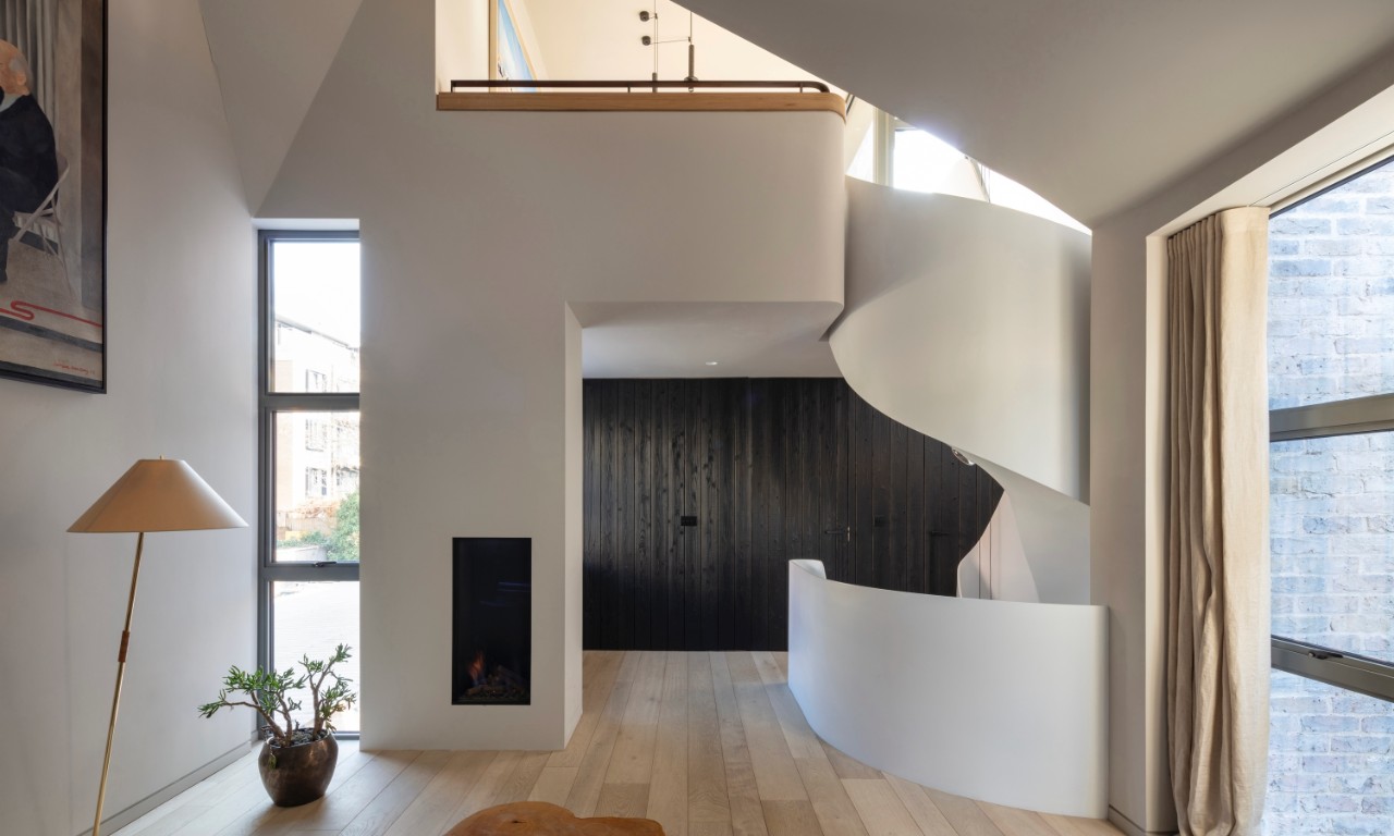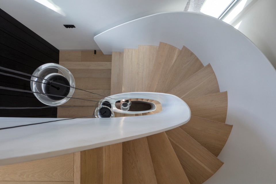 Il fulcro dell'abitazione trasformata è uno spazio aperto a doppia altezza, caratterizzato da una scala a chiocciola tailor-made che collega i tre piani, dando vita a una continuità tra le diverse aree della casa seppur poste su più livelli. La scala – un “vortice scultoreo di spazio illuminato a giorno” – grazie alla sua forma organica, diventa il cuore pulsante dell’abitazione, contribuendo a rompere la rigida geometria di una casa londinese dei primi del Novecento.
