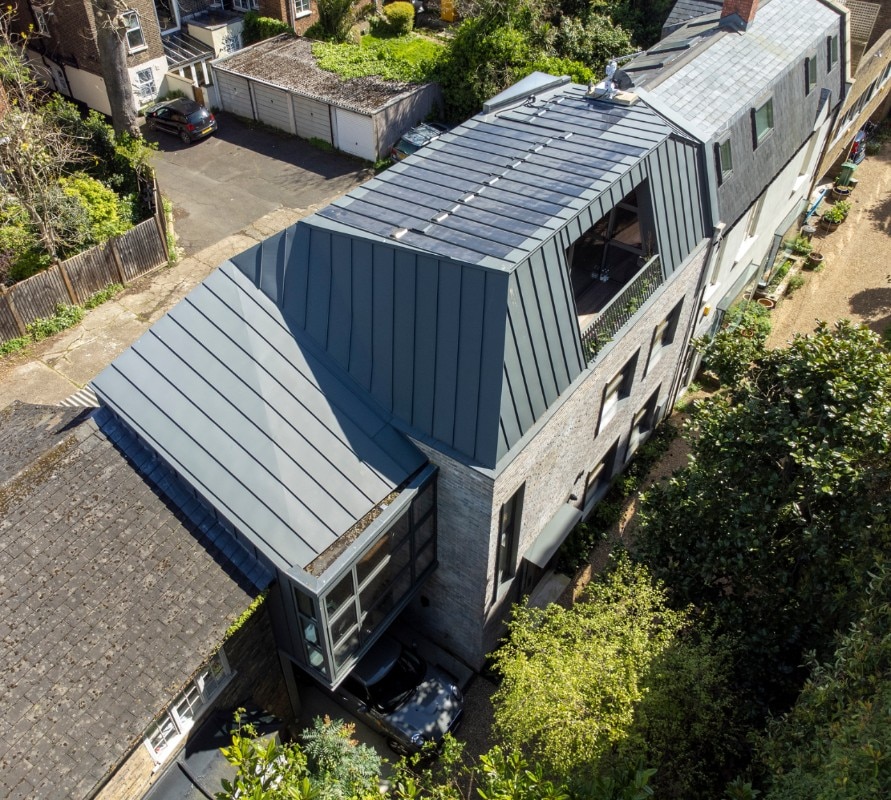 L’attenzione alla sostenibilità, poi, si esprime non solo nelle tecnologie all’avanguardia, ma anche attraverso il recupero creativo dei materiali: le travi in legno originali sono state riciclate per creare nuovi complementi d’arredo, come armadi e piani di lavoro, dando nuova vita a materiali storici. Inoltre, l’edificio è dotato di un sistema energetico che unisce un tetto rivestito di pannelli fotovoltaici integrati ad un sistema di riscaldamento radiante e una batteria per l’alimentazione notturna sia della casa sia di un’auto elettrica.