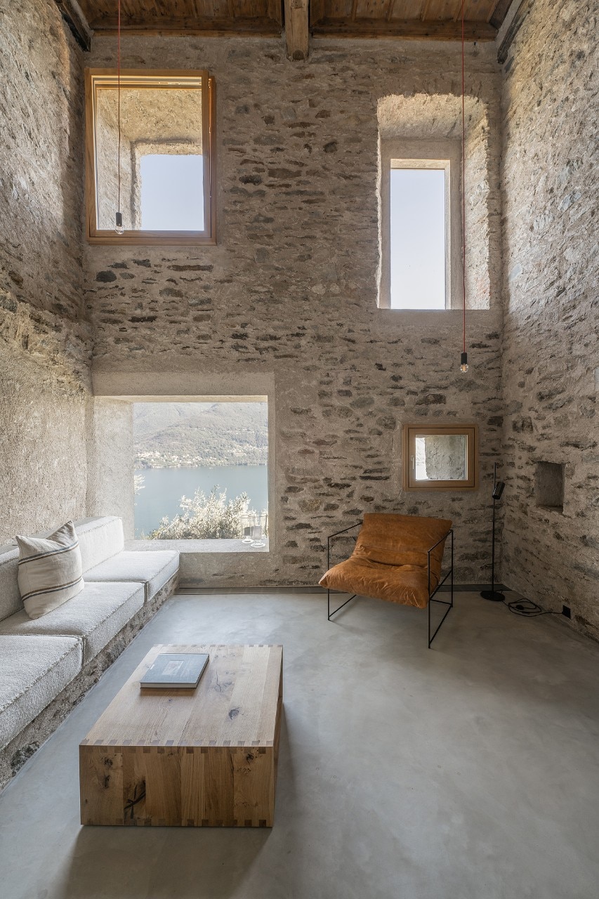 Il progetto ha trasformato una vecchia casa contadina immersa nell’atmosfera del Verbano lasciandola in uno stato di apparente rovina, con interventi chirurgici che mettono in mostra le qualità intrinseche dell’edificio originale. L’approccio di “conversione delicata” che caratterizza il lavoro degli architetti non punta alla conservazione integrale, bensì a una trasformazione attenta, che lascia in vista i muri in pietra locale, integrando grandi aperture asimmetriche che orientano lo sguardo verso il paesaggio lacustre.