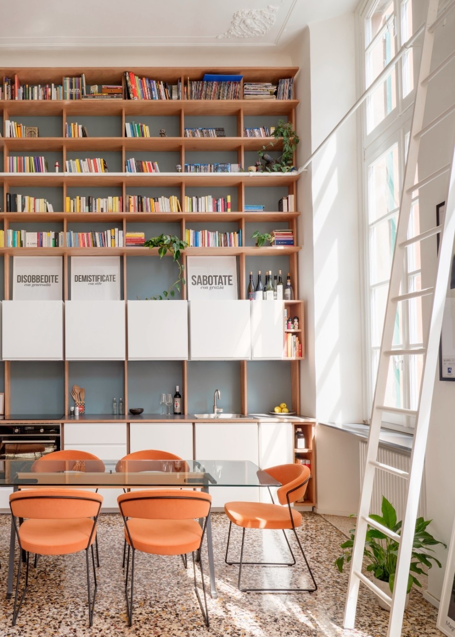 La storia di questo miniappartamento completato dallo studio llabb è in realtà l’incrocio di una molteplicità di storie: quella del centro storico di Genova in trasformazione, quella dei suoi palazzi monumentali talvolta ampiamente rimaneggiati, quella dell’abitare contemporaneo fatto di case sempre più piccole, e quella di una coppia che chiedeva di poter lavorare da casa, ospitare amici e soprattutto poter raccogliere una gran collezione di libri, cataloghi e opere d’arte.