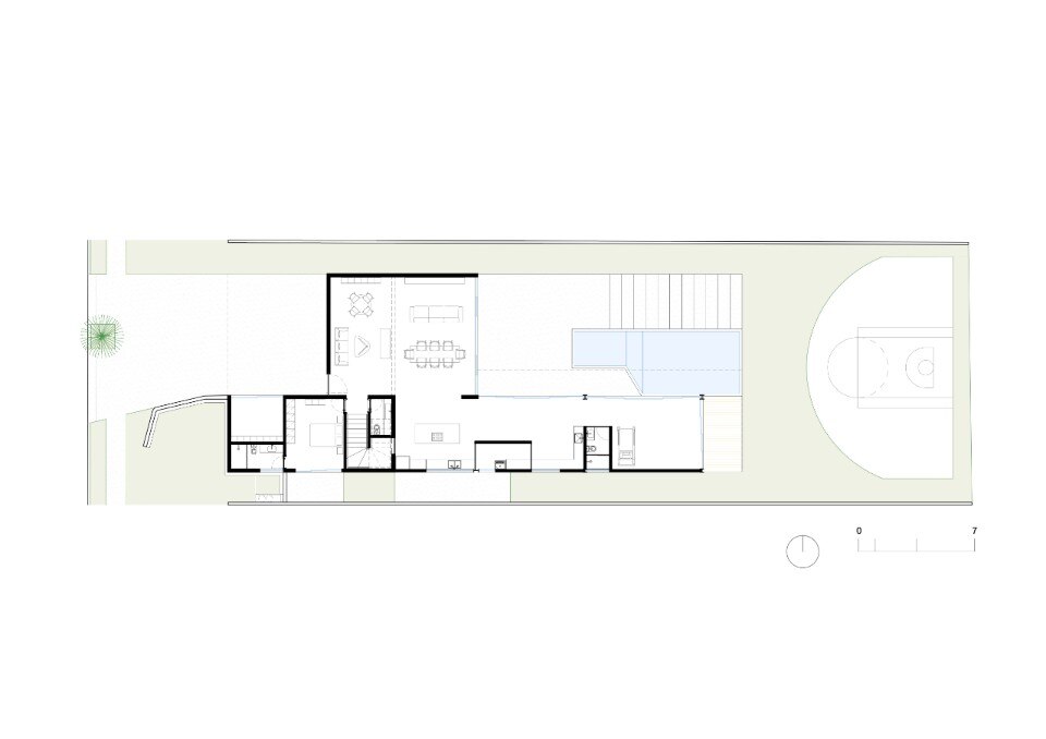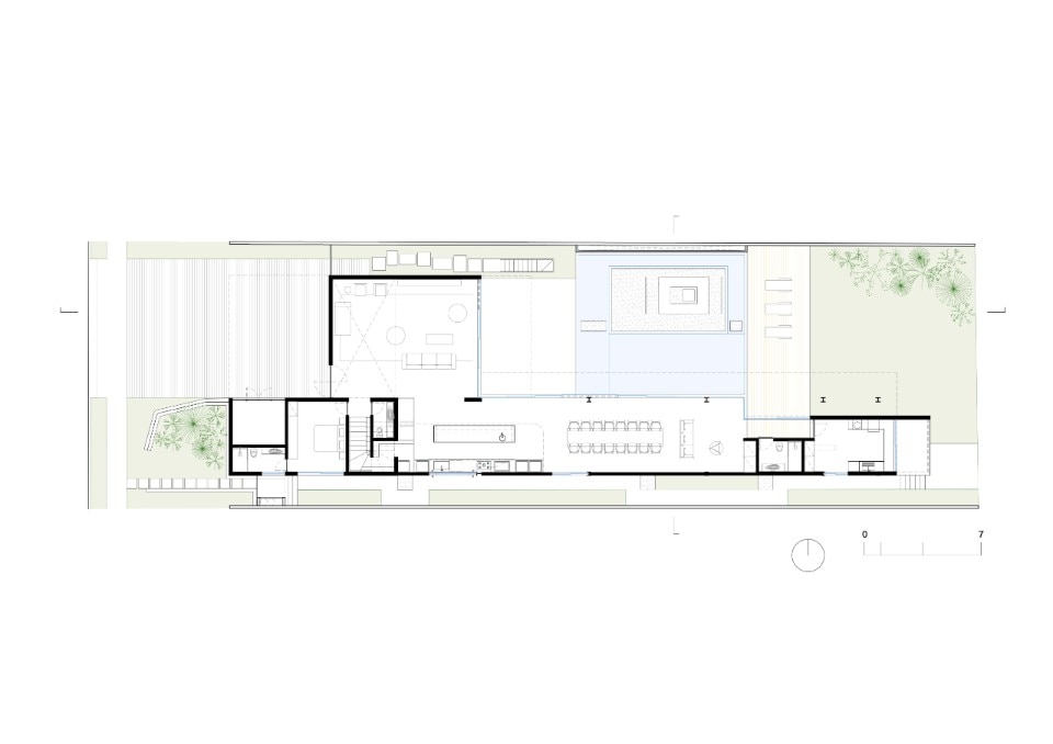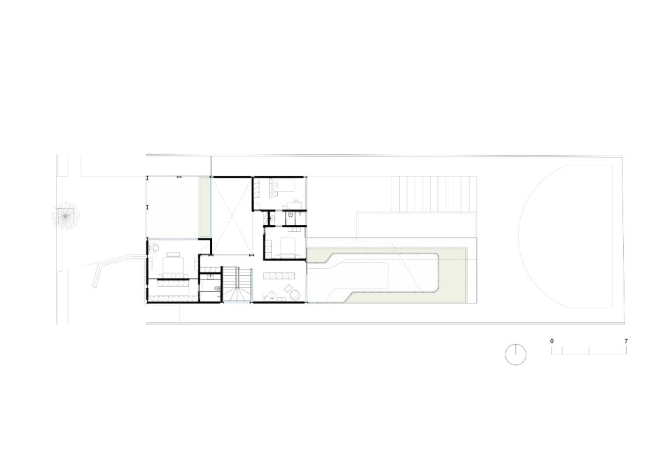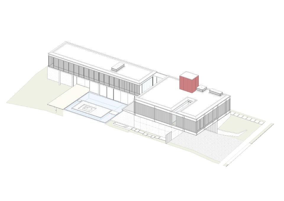 L’impiego di una struttura puntiforme in acciaio per l’ampliamento ha consentito di realizzare uno spazio fluido e libero da partizioni, dove la luce si distribuisce generosamente da nord, filtrata dallo schermo di pannelli mobili a listelli metallici che interrompono la continuità della facciata in vetro. L’espansione della piscina, che lambisce una terrazza in legno adagiata sul terreno in pendenza, moltiplica gli spazi di relax all’aperto.