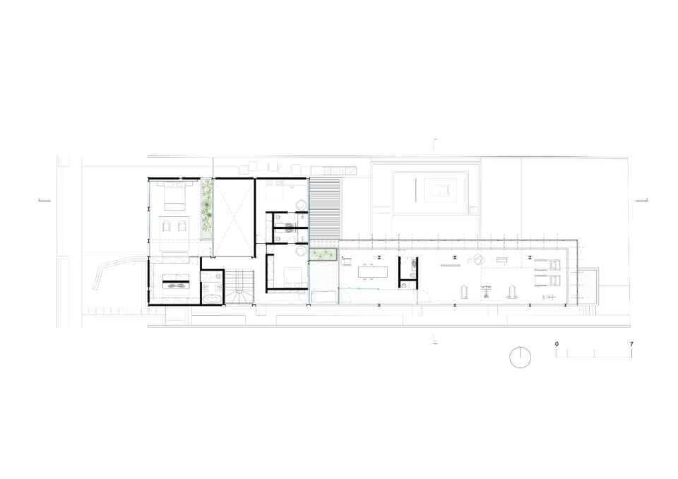 La seconda fase ha previsto un incremento planivolumetrico del corpo ad un piano collocato a sud del lotto: se il piano terra resta il fulcro della vita comunitaria familiare, il piano superiore, ampliato, ospita ora oltre alle camere da letto un ufficio e una palestra con vista sul giardino.