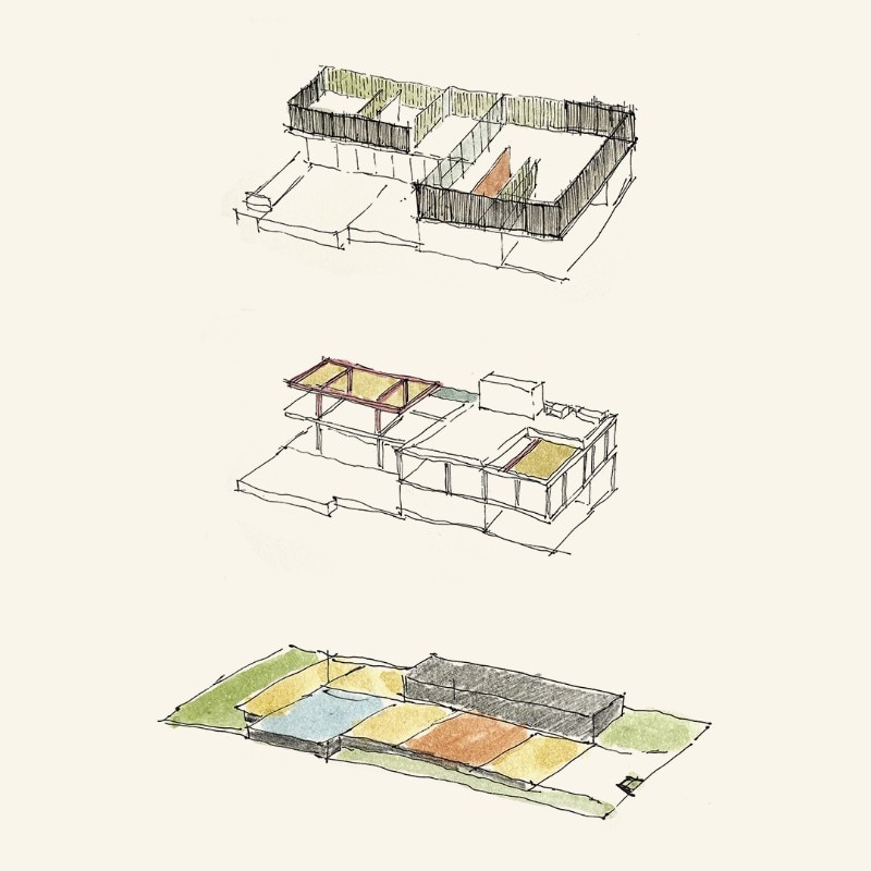 L’intervento è stato realizzato in due fasi, a causa dell’interruzione del processo esecutivo al tempo della pandemia e del contestuale cambio di proprietà. Il nuovo acquirente ha deciso di adeguare il progetto alle proprie esigenze, mantenendo tuttavia l’impianto originario della prima fase: un volume ad L, composto da un corpo a due piani, e da uno a un piano solo, ad esso perpendicolare, introverso sul fronte stradale e aperto invece al giardino con piscina; la zona giorno è al piano terra, gli ambienti privati invece al livello superiore.