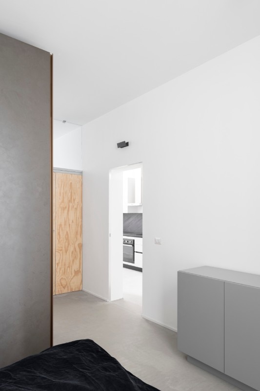 Il fratello maggiore – libero professionista – ha scelto l’unità più ampia, composta da due campate. Qui, la zona giorno si sviluppa in un unico spazio continuo, con la cucina schermata dal setto che la separa dal bagno. La zona notte, nell’altra campata, è suddivisa in due ambienti distinti da una cabina armadio centrale.