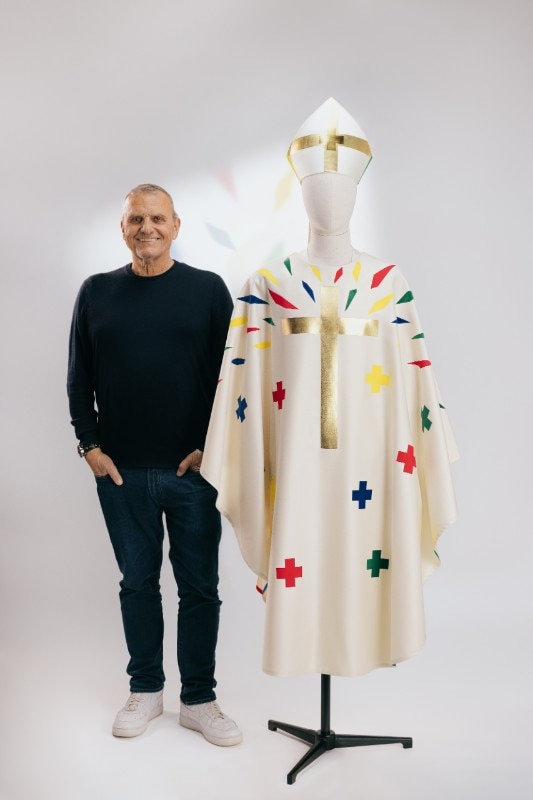 Con la complicità della Diocesi di Parigi, Jean-Charles de Castelbajac, celebre artista francese abituato a far convivere il mondo della moda con quello del design, ha progettato una linea di abiti liturgici grafica ed incisiva, basata sulla restituzione astratta dell’esperienza della luce nella cattedrale. “La luce e il suo splendore hanno guidato il mio gesto creativo, ho pensato alla brillantezza del colore sulla risorgente pietra bionda di Notre-Dame. Il mio lavoro è legato al ritmo cromatico e alla forza dell'oro. Facendo eco alle vetrate colorate, il colore è onnipresente sulle pianete bianche, attorno alla croce dorata”. Abiti e accessori sono stati prodotti da cinque maison d’art specializzate nella confezione, nel ricamo a mano e nella metallurgia: Lesage, Goossens, Paloma, Atelier Montex e Maison Michel, tutti residenti sotto il tetto di 19M, il quartier generale di Chanel dedicato ai mestieri d’arte.