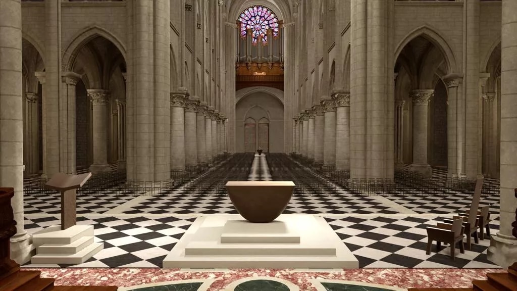 Il 7 dicembre 2024, a poco più di cinque anni dall’incendio, Notre Dame riaprirà con una cerimonia ufficiale presieduta dall’Arcivescovo di Parigi alla presenza di numerosi capi di stato e mecenati, mentre il giorno successivo la cattedrale potrà riaprire le porte ai propri fedeli. Grazie alla pulizia e al restauro, la chiesa ha ritrovato una nuova luminosità: varcata la soglia, i colori di pittura e vetrate, vividissimi, spiccano sulla pietra chiara, restituendo un barlume dell’emozione che i pellegrini dovevano provare varcando il suo Portale del Giudizio. Qualche novità si affaccia però a questo processo di restituzione che ha fatto della fedeltà al progetto originario una pietra angolare, prendendosi il rischio di un aspetto po’ troppo patinato. Il contributo più squisitamente contemporaneo arriva là dove le variazioni sono tradizionalmente mal viste: i paramenti sacri.