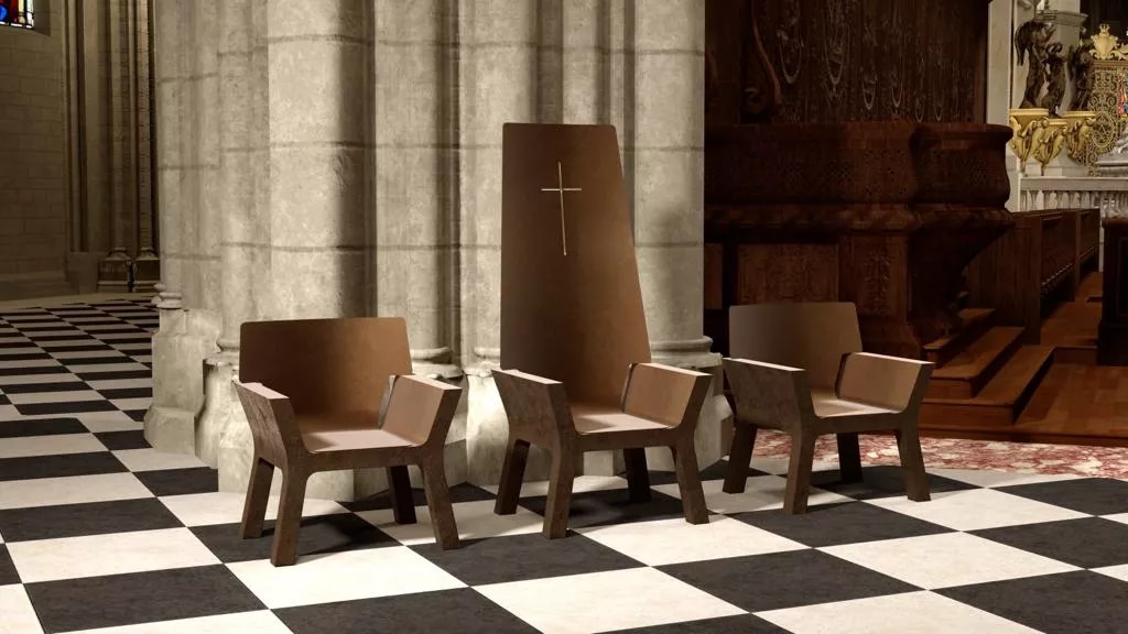 Le 1500 sedie della navata centrale, progettate da Ionna Vautrin e prodotte da Bosc, falegnameria a conduzione familiare di Hagetmau, decaduto distretto della sedia nel sud est della Francia, sono state anch’esse concepite all’unisono con l’architettura come una prova di umiltà di fronte alla grandiosità emblematica di questo luogo. Vautrin ha parlato di “semplicità nobile”: sempre usando le sue parole, “la trasparenza e l'altezza della sedia le conferiscono una postura di umiltà e abnegazione, sottolineando al contempo la vertiginosa verticalità della cattedrale. Il suo schienale leggermente abbassato invita i fedeli a utilizzarlo come tavolo di preghiera appoggiandosi in prima fila. La sua silhouette morbida e affabile accoglie comodamente i visitatori per seguire una funzione, ascoltare un concerto o meditare”. Impilabili, possono essere attaccate l’una con l’altra attraverso un giunto in ottone per definire delle linee perfettamente rettilinee.