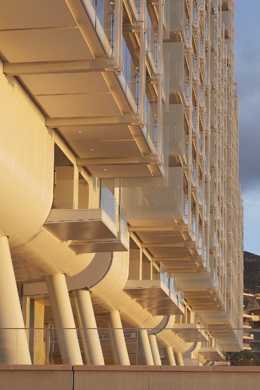 In questo nuovo lembo di terra artificiale, un edificio, il Le Renzo, svetta sulla passeggiata pubblica del molo, richiamando morfologia e materiali dell’architettura navale. Il nome, come è facile intuire, è un omaggio esplicito a chi l’ha costruito, lo studio di Renzo Piano. Eretto su pilotis e rivestito di alluminio marino bianco, è concepito come un filtro capace di permettere un’osmosi tra l’orizzonte del mare e la montagna retrostante. La facciata, distinta dalla presenza di balconi che si affacciano sull’orizzonte, crea un disegno particolarmente armonioso grazie all’inserimento di barre verticali in bilanciamento. Joost Moolhuijzen e Erik Volz di Renzo Piano Building Workshop raccontano a Domus: “Con Le Renzo abbiamo parzialmente condannato la vista dal vecchio lungomare: il nostro obiettivo era dunque quello di restituirla. Questo è il motivo per cui abbiamo rialzato l'edificio, così da far vedere l'orizzonte. Ricondurre il concetto dell’edificio ad un semplice riferimento a una nave sarebbe però troppo banale: l’idea va oltre. Si tratta piuttosto di come la luce viene catturata e portata nello spazio in modo morbido e naturale, creando un ambiente generoso e accogliente, oltre che accessibile al pubblico”.