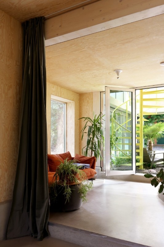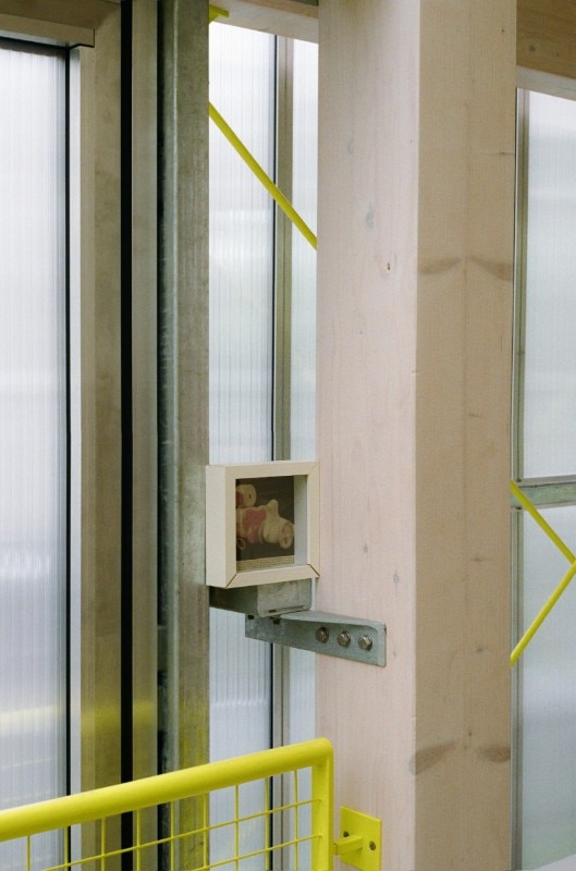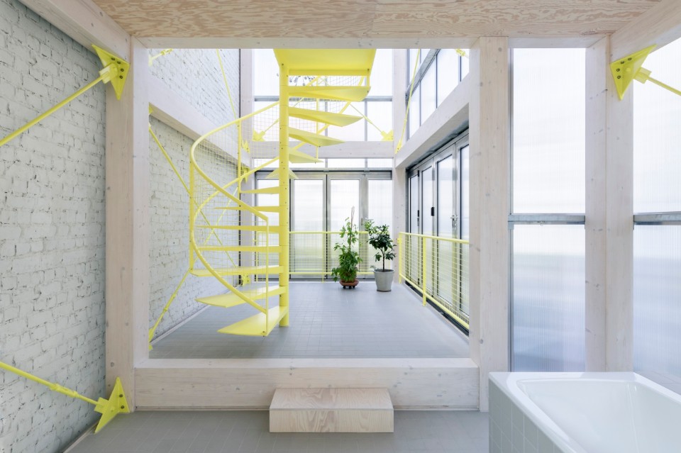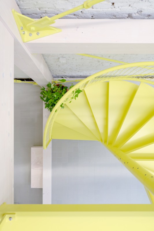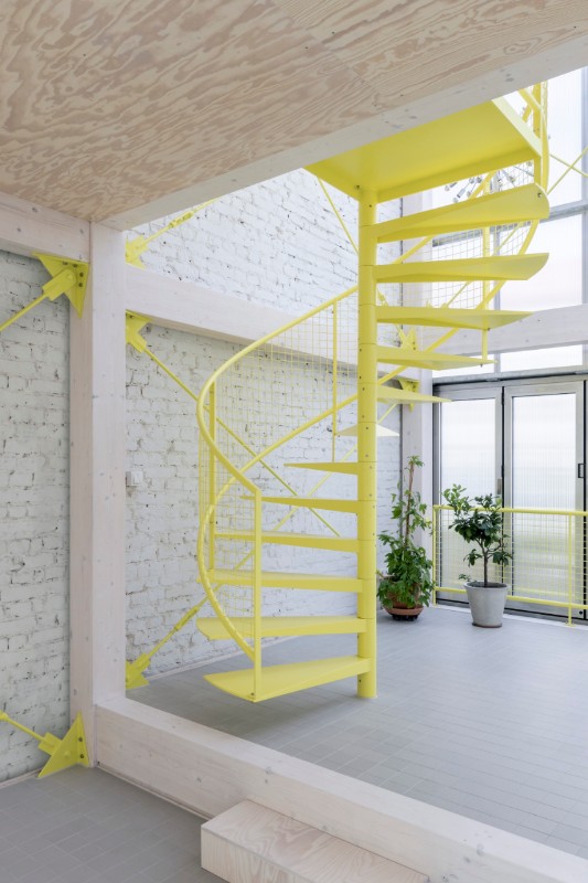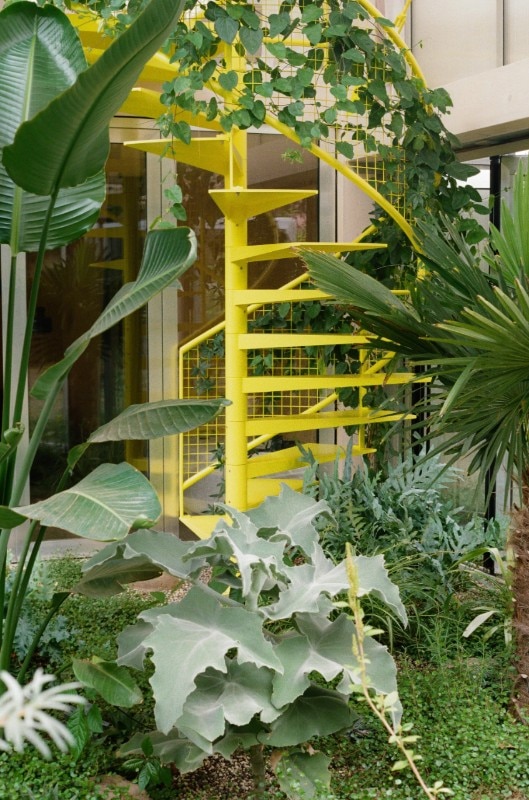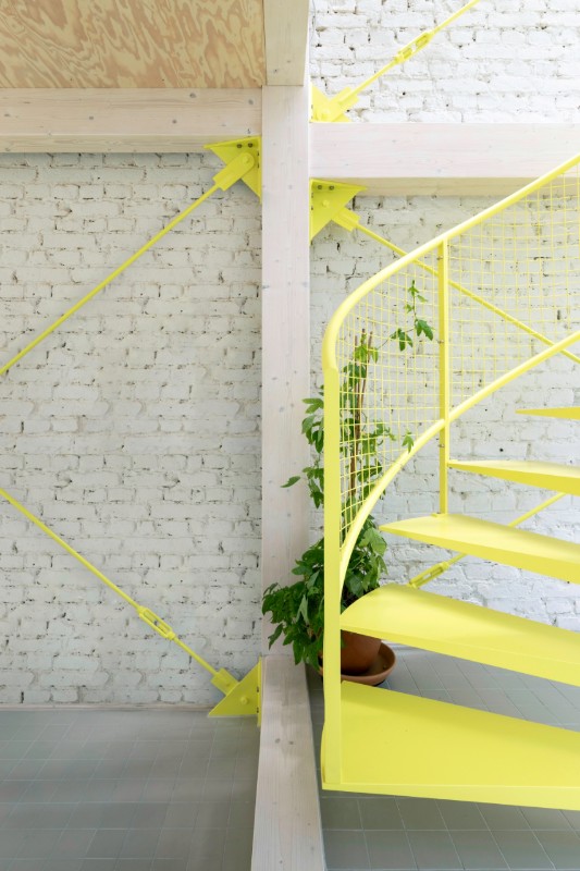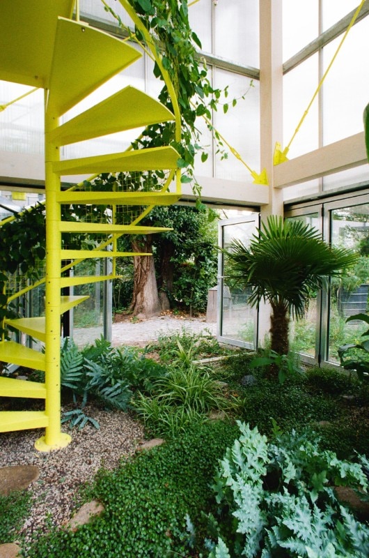 Il linguaggio dell’architettura, poi è quell’ estetica della tecnica che arriva dal legno chiaro della struttura, dal metallo e dai policarbonati del rivestimento, tutto poi messo a sistema dal verde pervasivo delle piante e dal giallo limone della scala che percorre tutti i vuoti.