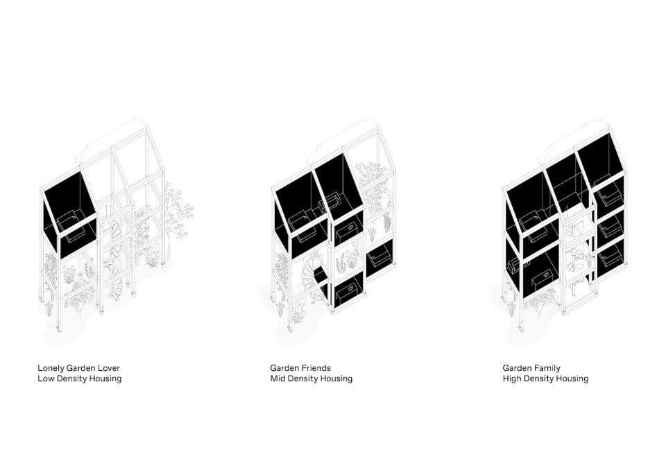 Il fattore tempo, a tutte le sue possibil scale, è cruciale per questo progetto, e per il suo ruolo nell’ambiente: lungo l’anno, il giardino abitabile mitiga i freddi invernali come i caldi estivi; sul lungo periodo, esigenze abitative diverse possono far scegliere di chiudere o aprire diversi moduli nella struttura. Questa, oltretutto, è realizzata solo con elementi avvitati che non richiedono sigillature o uso di colla, un dettaglio che influisce molto sul ciclo di vita complessivo del manufatto, inclusivo di eventuali smantellamenti e smaltimenti. Tutte soluzioni che come immediato e prolungato effetto hanno la riduzione del bilancio CO2 legato all’edificio.