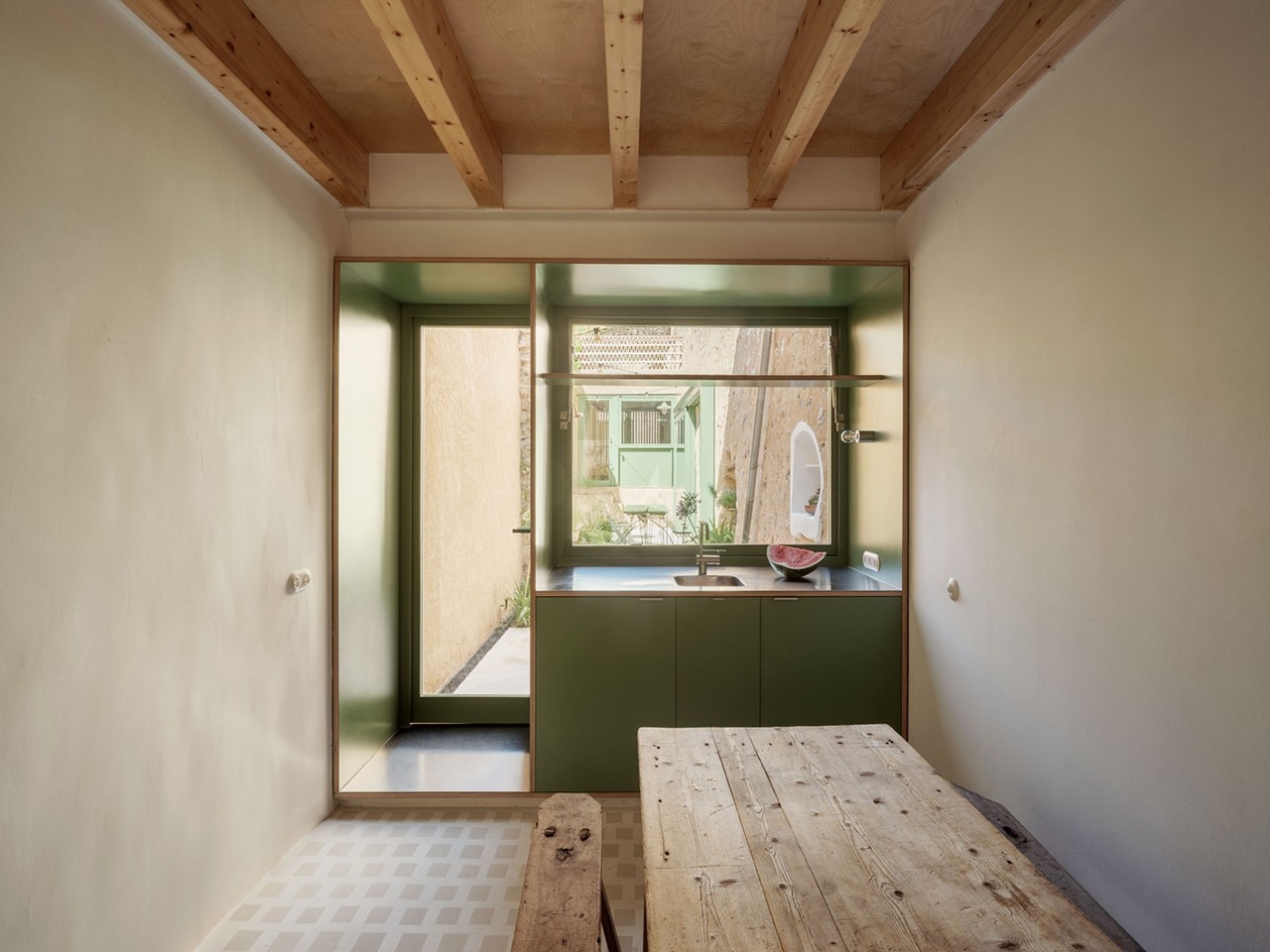 Casa Mila è fatta di poche cose: luce, che permea lo spazio, malta di calce, bianca e liscia negli interni e terrosa e ruvida per le facciate, elementi lignei verdi, e un pavimento palladiano rivisitato. Attraverso questi elementi lo studio Isla disegna due abitazioni, una principale e una guest house, connesse da un lungo e stretto patio.