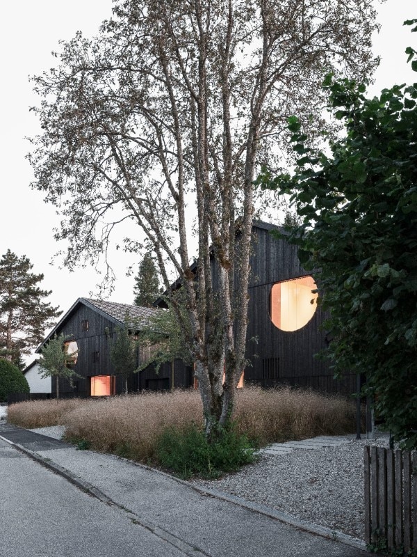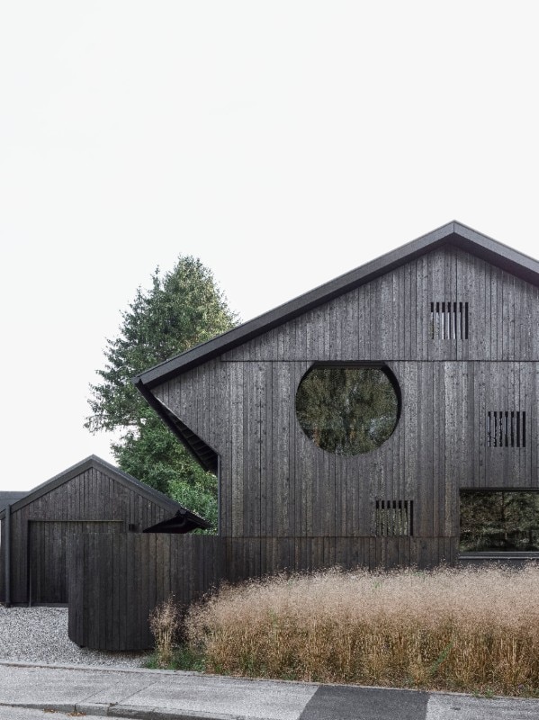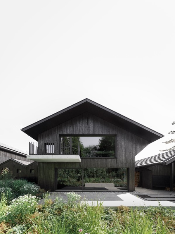 Il complesso immerso in un vasto giardino consiste in due volumi “gemelli”, dalla geometria elementare e quasi archetipica: due parallelepipedi con copertura a doppia falda (forse a citazione dell’iconica capanna nei boschi) quasi speculari e affiancati, tra i quali si dispongono i corpi più bassi delle autorimesse affacciate verso la strada. Gli involucri austeri, rivestiti in legno carbonizzato, intercettano i colori del paesaggio e si aprono in ampie finestre verso il giardino, sottili fenditure e irriverenti squarci circolari che conferiscono un insolito carattere giocoso alla composizione.