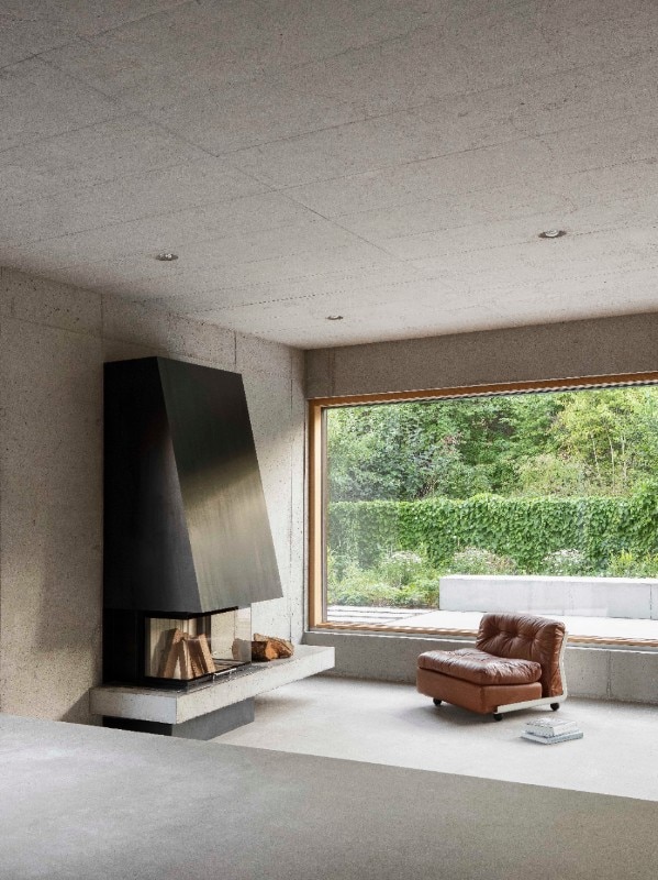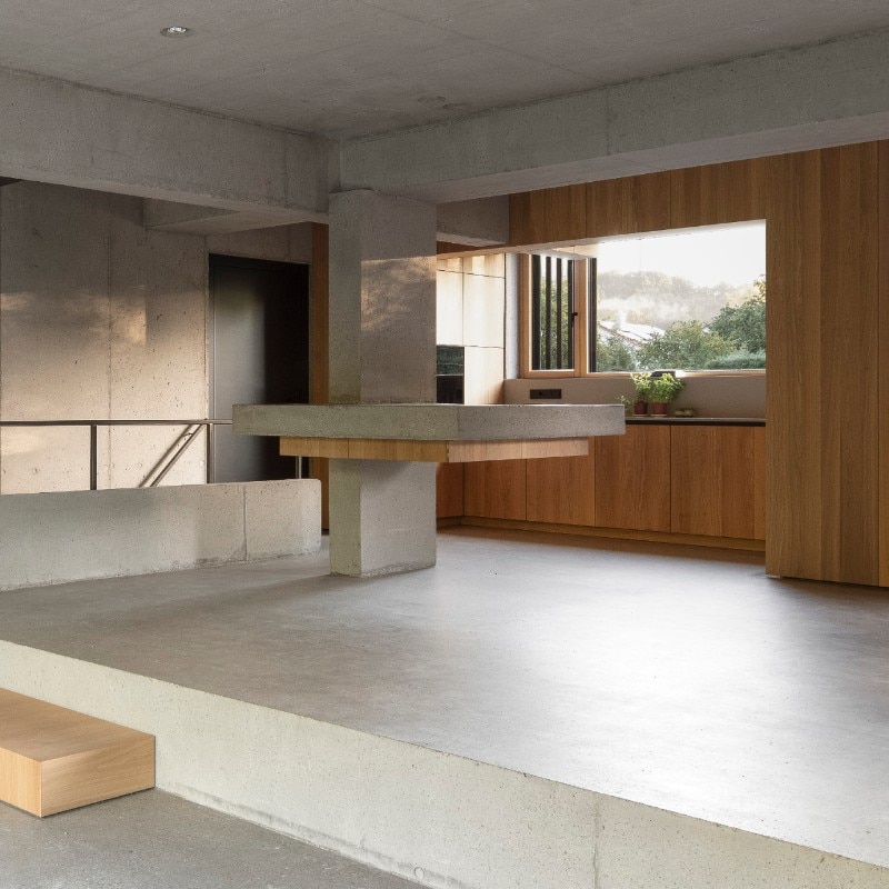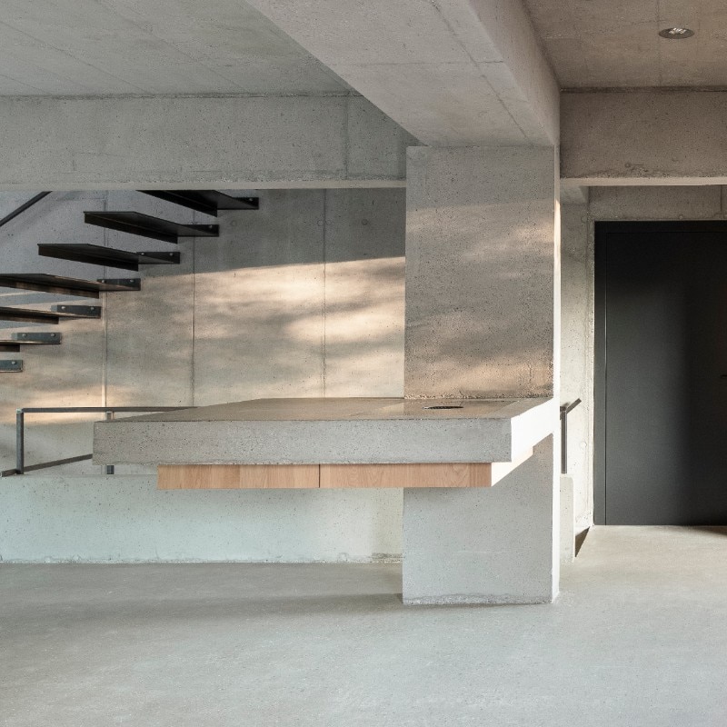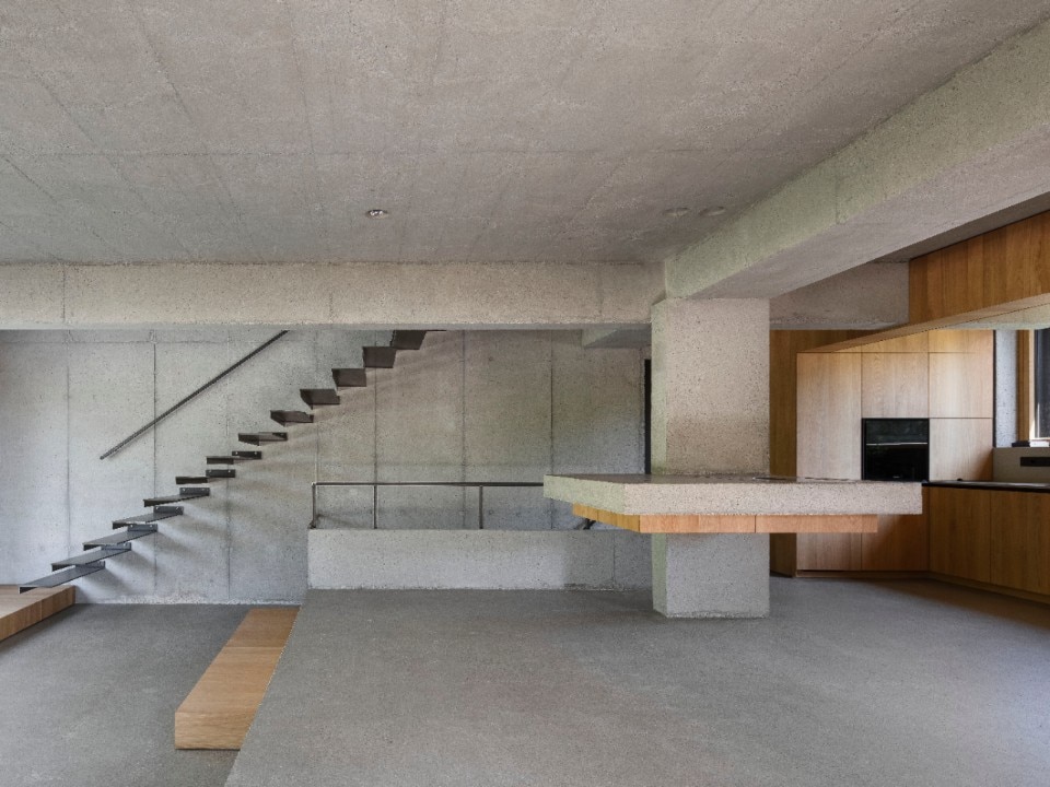 Una felice ibridazione tra involucro strutturale e arredo governa il progetto degli interni, all’insegna di un equilibrato rapporto tra funzionalità e ricerca estetica: dal bancone della cucina incastonato nel pilastro portante, ai mobili in rovere della cucina e del ripostiglio a incasso nella struttura, ai pianerottoli in quercia utilizzati come spazi di contenimento. Le finiture delle pareti in cemento sabbiato e dei pavimenti in cemento levigato (al piano terra) e rovere (al piano primo) conferiscono un carattere piacevolmente essenziale, ma caldo e accogliente, allo spazio.
