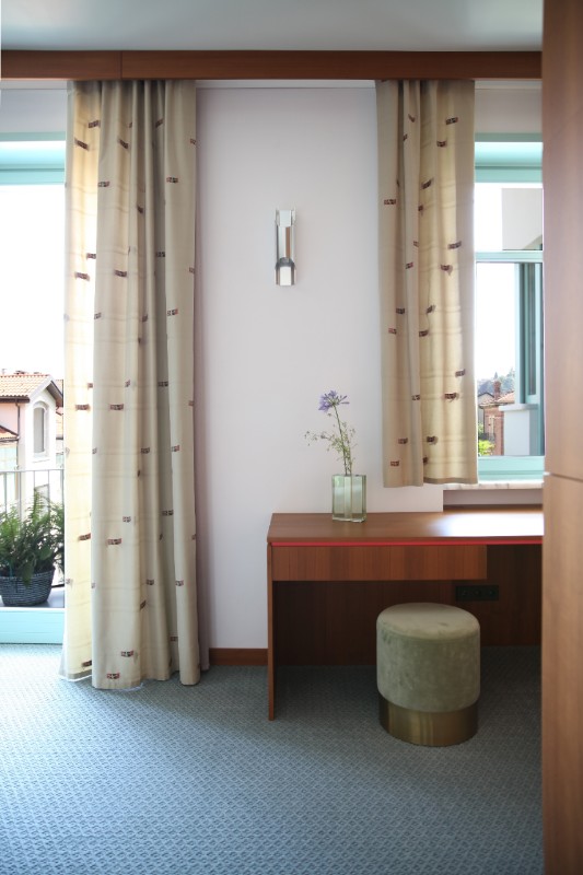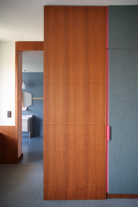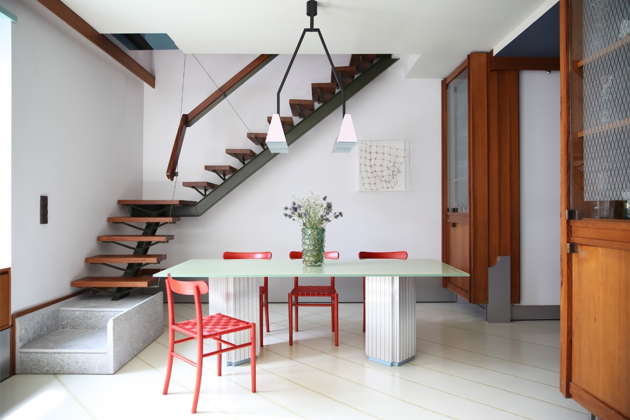 È un dialogo che si estende nella scelta degli arredi, che combinano alle sedie di Jasper Morrison le poltrone anni ’50 di Arflex, e soprattutto in quella galassia di dettagli custom, di decorazioni essenzializzate e dominate da color blocking in toni primari o pastello che ricorrono nel linguaggio dello studio, qui impegnati nel dare voce a un abitare borghese estremamente radicato nel tempo attuale, puntando intanto a dare, come dicono proprio i progettisti, “nuova vita ad Ada Bursi”.