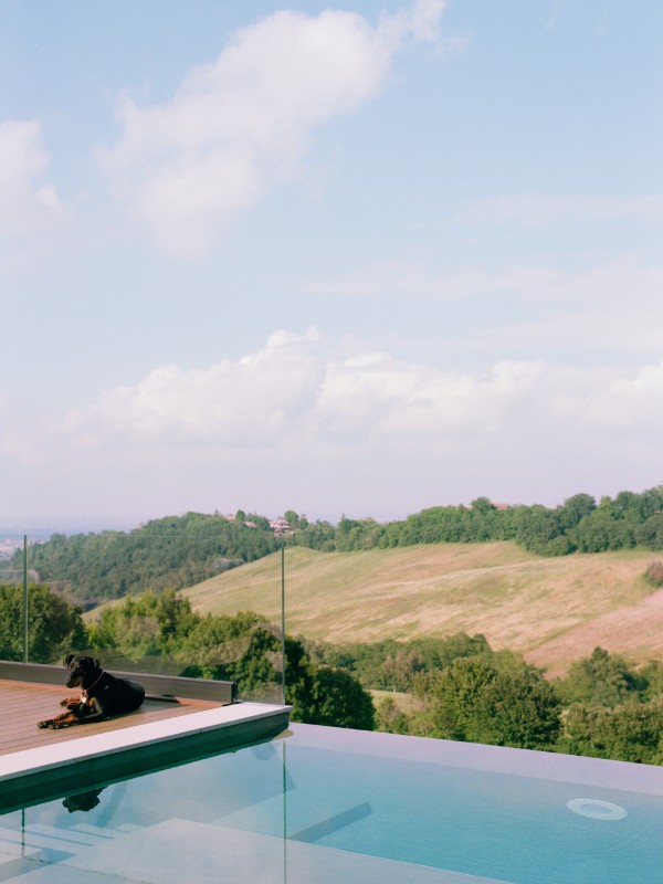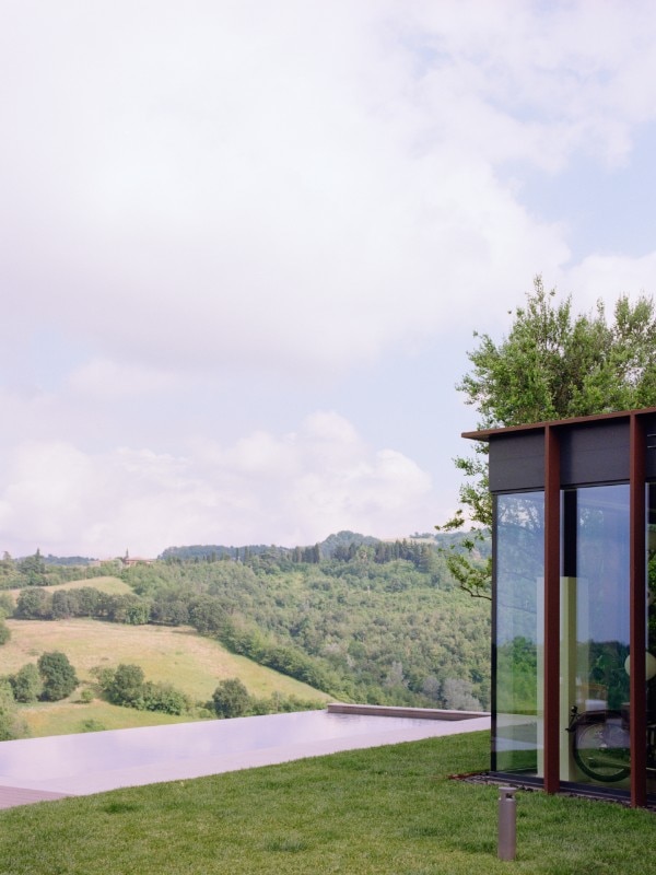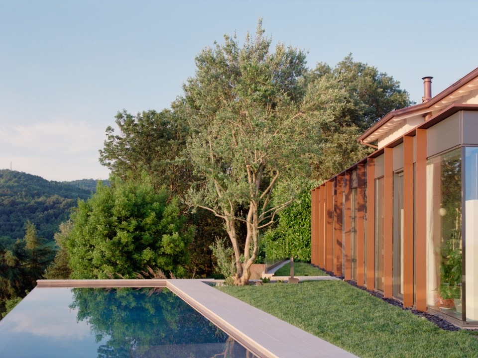 Una piscina a sfioro, a sbalzo sul crinale, e nuove superfici verdi nate col terrazzamento a terre armate, incoraggiano le attività en plein air e il godimento della campagna.
