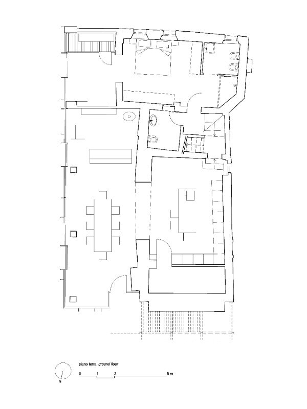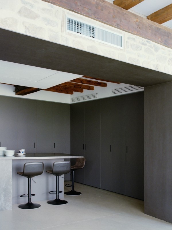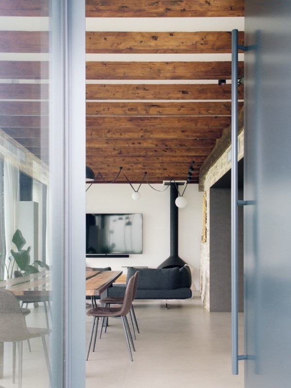 All’interno, ambienti dal sapore schiettamente contemporaneo accolgono nell’intimità dell’abitazione, dove le trame ruvide e corpose dei materiali esistenti (murature in sasso a vista e travetti in legno recuperati e riutilizzati nel tetto piano dell’ampliamento) coesistono con le finiture neutre e delicate dei pavimenti e con gli arredi essenziali ma eleganti.