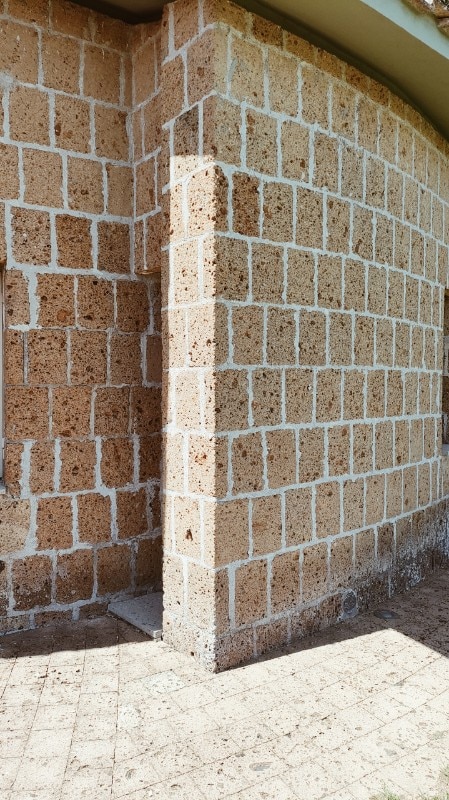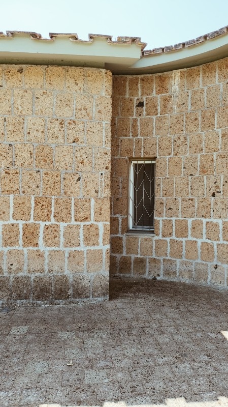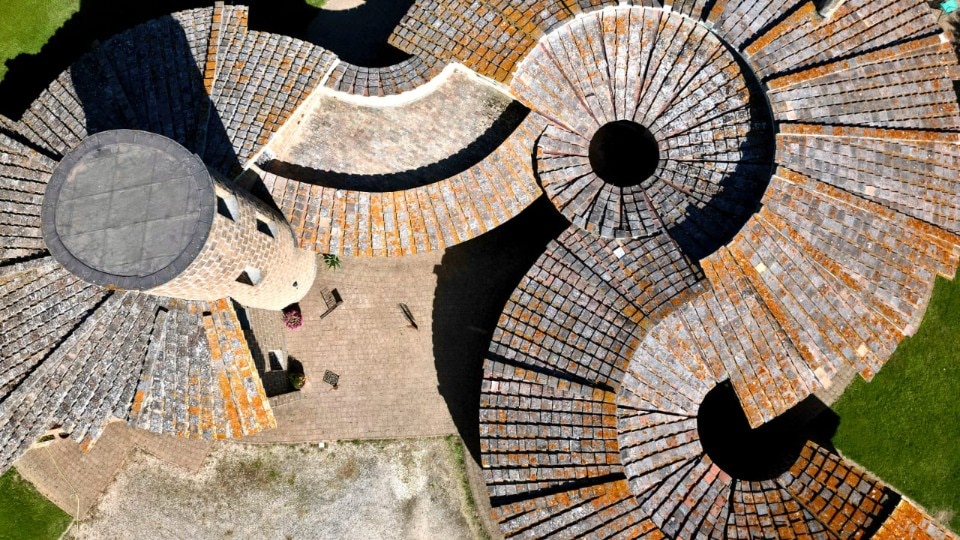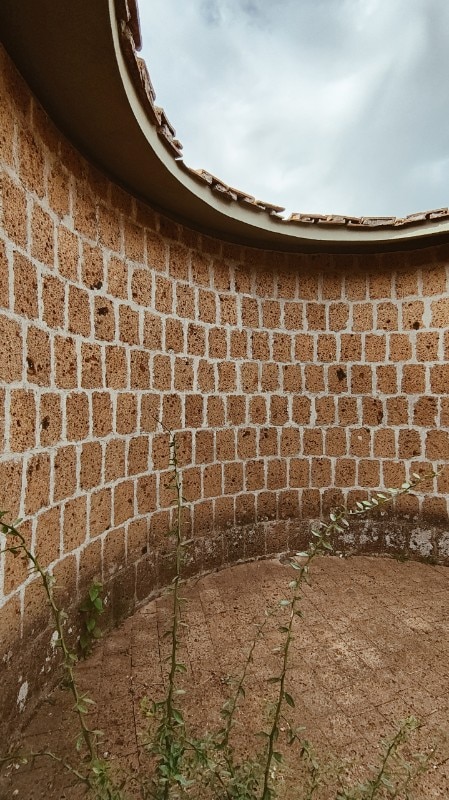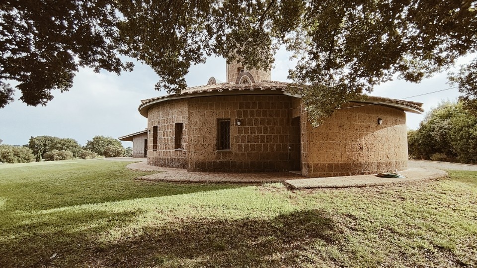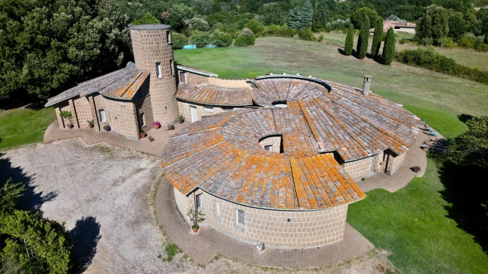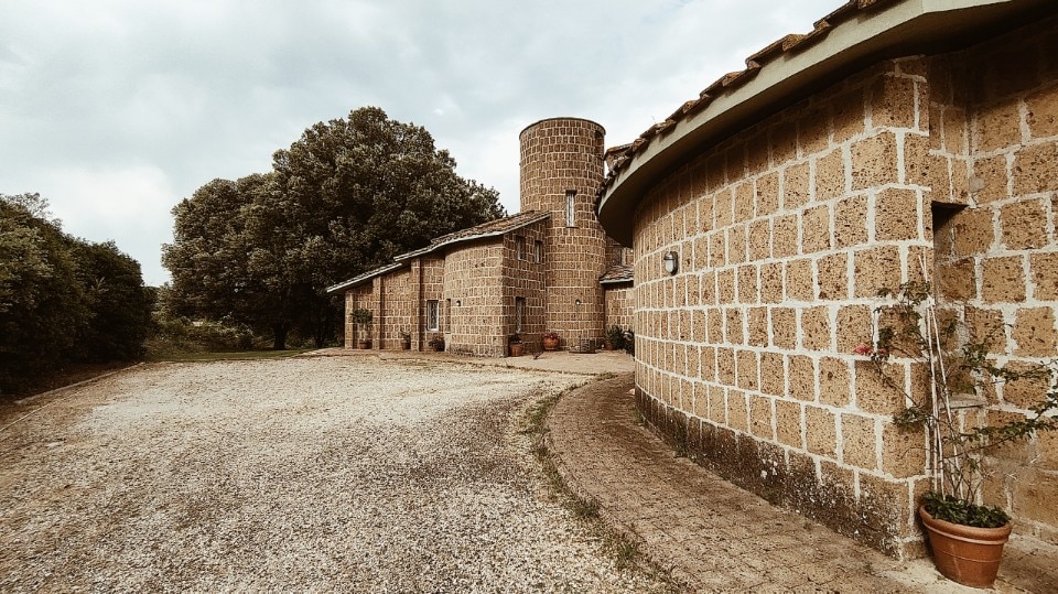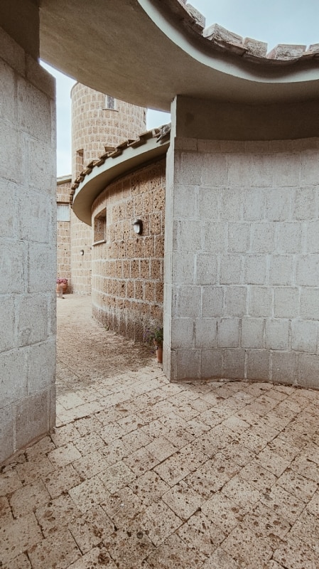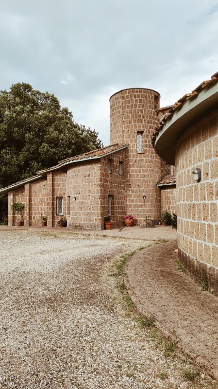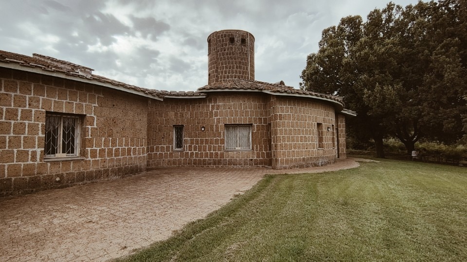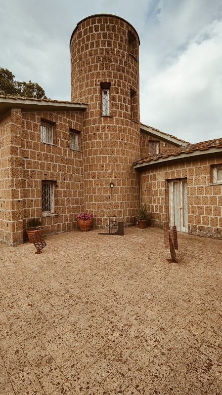 La realizzazione, interamente in blocchi di tufo locale e coperta da tetti tronco-conici rivestiti in coppi, evoca architetture rurali laziali, reinterpretate alla luce del pensiero borrominiano e dell’architettura organica, e l’ingresso principale, è di fatto uno dei tre perni di questo villaggio-casa.