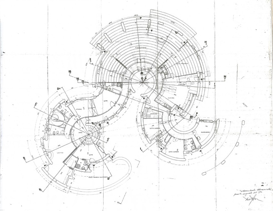 Va detto che, come evidenziano i primi progetti di Portoghesi, questa zona in origine era stata pensata come un immenso patio pavimentato, aperto interamente alla natura. Il salone sviluppato a ventaglio divide il secondo fuoco della villa – dedicato ai servizi – dal terzo, dove sei camere di varie dimensioni formano la zona della famiglia.