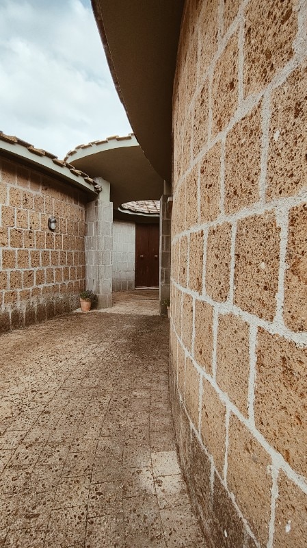 La forma che l’abitazione assume nel tempo – evolutiva, frammentata e continua – è il riflesso di una ricerca architettonica incentrata sul concetto di micro-villaggio policentrico. Non c’è una facciata principale, non c’è un asse di simmetria: tutto si sviluppa come una successione fluida di curve, torri, patii e corti, ognuno con un orientamento specifico verso il paesaggio. La casa, non avendo un prospetto principale, si mostra differente da ogni angolazione, come una creatura che cambia aspetto man mano che ci si muove attorno ad essa. Sul lato concavo interno offre spazi raccolti e ombreggiati, quasi un abbraccio architettonico che protegge la vita privata; sul lato convesso esterno si apre invece al panorama, dialogando a distanza con il Santuario del Sorbo.