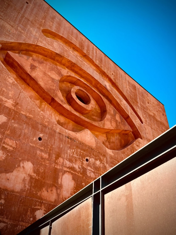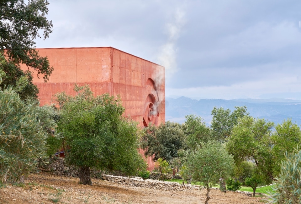 L’opera ospita un frantoio in funzione, un ristorante, una zona degustazione e un museo dedicato all’arte dell’olio d’oliva. Un monolitico cubo in cemento rosso si staglia nel paesaggio andaluso con il carattere indecifrabile di un’opera d’arte surrealista, dove un occhio che sputa fumo, intagliato nella struttura, scruta e dà il benvenuto ai visitatori. Un enorme corno di toro in acciaio, una mezza oliva gigante e un tubo da cui sgorga acqua che inonda una statua senza volto immersa in una vasca spuntano inspiegabilmente dalla struttura.