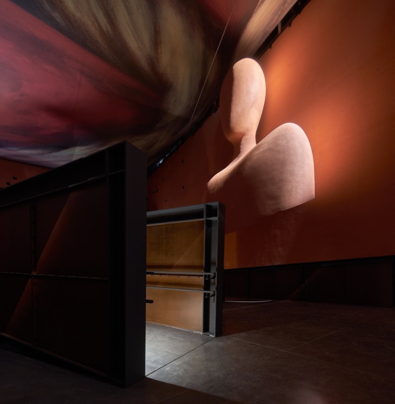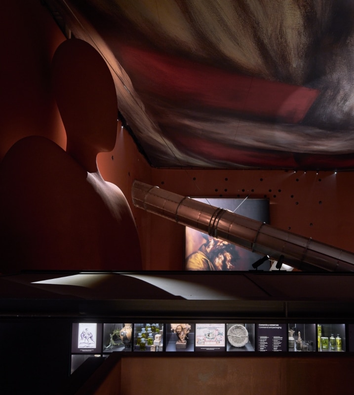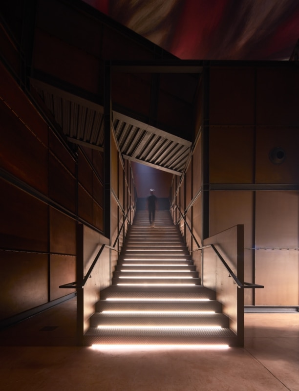 All’interno, intensi giochi chiaroscurali di ispirazione “caravaggesca” delineano i percorsi di visita attraverso le diverse fasi della produzione e accentuano la presenza scenica degli insoliti elementi che punteggiano lo spazio: dall’enorme spada da corrida che trafigge la copertura, al gigantesco ritratto di un celebre matador locale, all’ aereo realizzato con materiali di scarto, al tubo sospeso che trasporta le olive per la lavorazione. A stemperare l’atmosfera crepuscolare e onirica, una terrazza sospesa su catene invita ad uscire all’aperto e a proiettare lo sguardo sulla campagna e sugli uliveti.