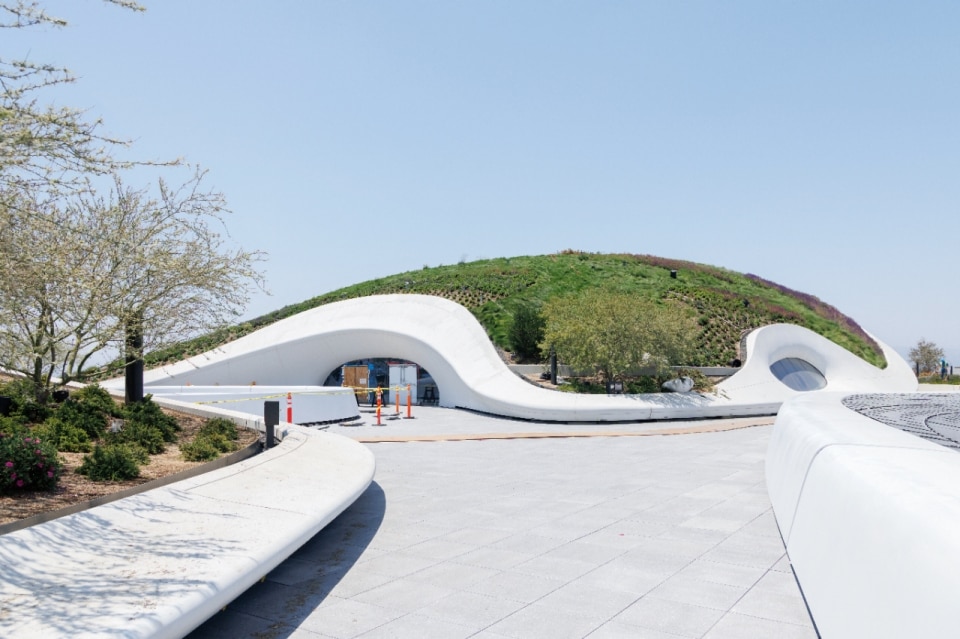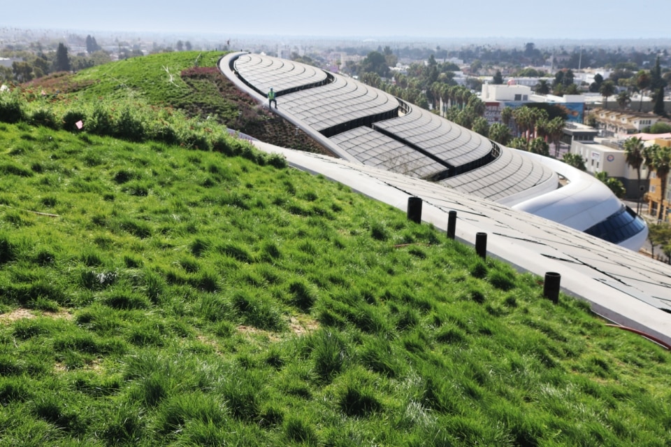 Mia Lehrer, del losangelino Studio-Mla, la concepisce come una superficie biodiversa, sostenibile e decisamente attrezzata – di sentieri, specchi d’acqua e dispositivi paesaggistici vari – in dialogo con il giardino pensile che si estende sul dorso nerboruto del museo stesso.