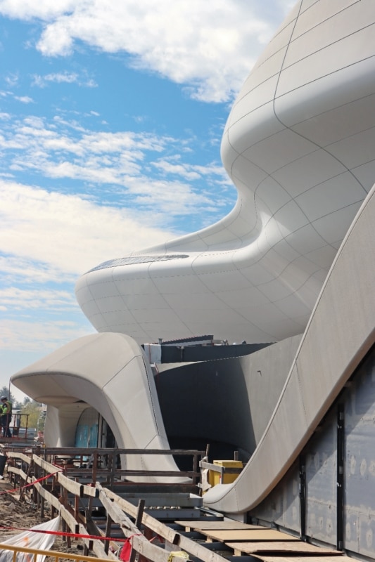 La formosità scultorea del Lucas Museum sembra evocare l’immaginario fantascientifico-spaziale che George Lucas ha contribuito a popolarizzare. A livello tecnico, l’edificio-astronave è rivestito da 1.500 pannelli di Frp, un polimero rinforzato con fibra di vetro, tutti differenti, come spesso accade per le più esuberanti architetture parametriche contemporanee. La complessità dei volumi costruiti prosegue nel parco.