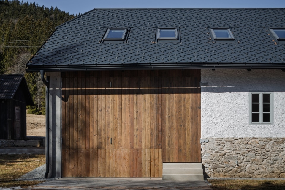 L’edificio si colloca in un’area punteggiata da storiche abitazioni per vacanze, lungo una strada che conduce nel cuore del bosco. All’esterno, mentre i fronti a nord-est e nord-ovest conservano la fisionomia originale con base in pietra e pareti intonacate, le facciate a sud-est e sud-ovest, in prossimità dell’ex corpo del fienile maggiormente compromesso dai precedenti interventi, riportano le tracce visibili del gesto contemporaneo: la struttura in cemento armato grezzo, perforata da due giocosi oculi e da ampi portali – a memoria delle aperture delle stalle – fa da supporto a pannelli in legno di larice scorrevoli, a protezione delle ampie vetrate e dell’intimità domestica, in dialogo materico e cromatico con il bosco. In copertura, la bordatura del tetto imita la “zmijovka”, il tradizionale berretto di lana indossato da secoli nella regione.
