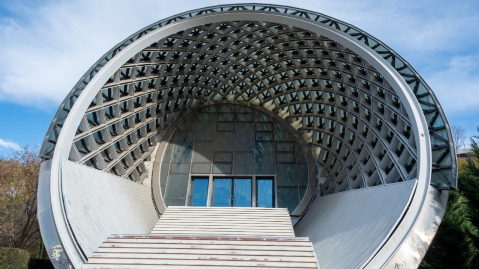 In realtà, come spiega Nino Tchatchkhiani, fondatrice del Tbilisi Architecture Archive, “l’edificio riprende formalmente le idee della proposta presentata da Fuksas al concorso per il Museo dell'Ermitage di Vilnius”, e non è davvero disegnato per essere site specific. Il progetto si sviluppa su un sito di 10mila metri quadrati ed è costituito da due elementi morbidi di forma diversa in calcestruzzo armato e acciaio, rivestiti con pannelli in acciaio e vetro, collegati tra loro come un unico corpo dal muro di contenimento a cui si appoggiano. Costato 40 milioni di euro, avrebbe dovuto contenere 550 posti a sedere, ma la parte interna non è mai stata terminata e l’auditorium è sempre rimasto vuoto e chiuso. Pur conservando una sua controversa bellezza, oggi giace nel parco accanto un parcheggio, come una grande carcassa di metallo. Rimanendo tuttavia il simbolo di una Georgia che, soprattutto dopo la rivoluzione del 2003, iniziava a sognare un percorso di integrazione europea.