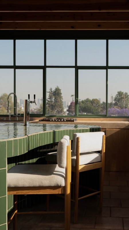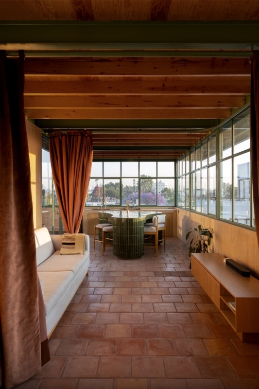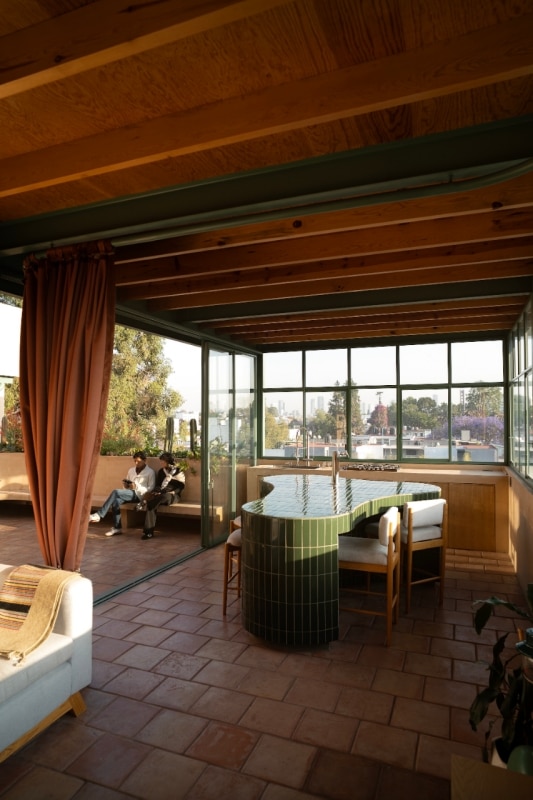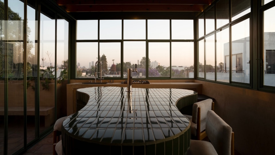 Il ruolo del bancone, del monolite piastrellato di verde che orienta l’intero spazio, è quello che ha la cucina nella tradizione messicana: “È un luogo che guarda alla vita della famiglia e dell’intera comunità, quello attorno a cui la vita si svolge per davvero, come in un ciclo: ti ritrovi e parli con la tua famiglia la mattina, mangi assieme a metà giornata e ceni assieme la sera; ma anche le feste e i ritrovi più larghi succedono lì. È il cuore della casa messicana”.