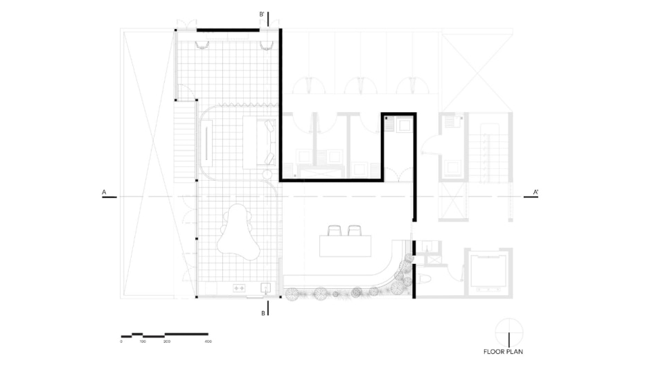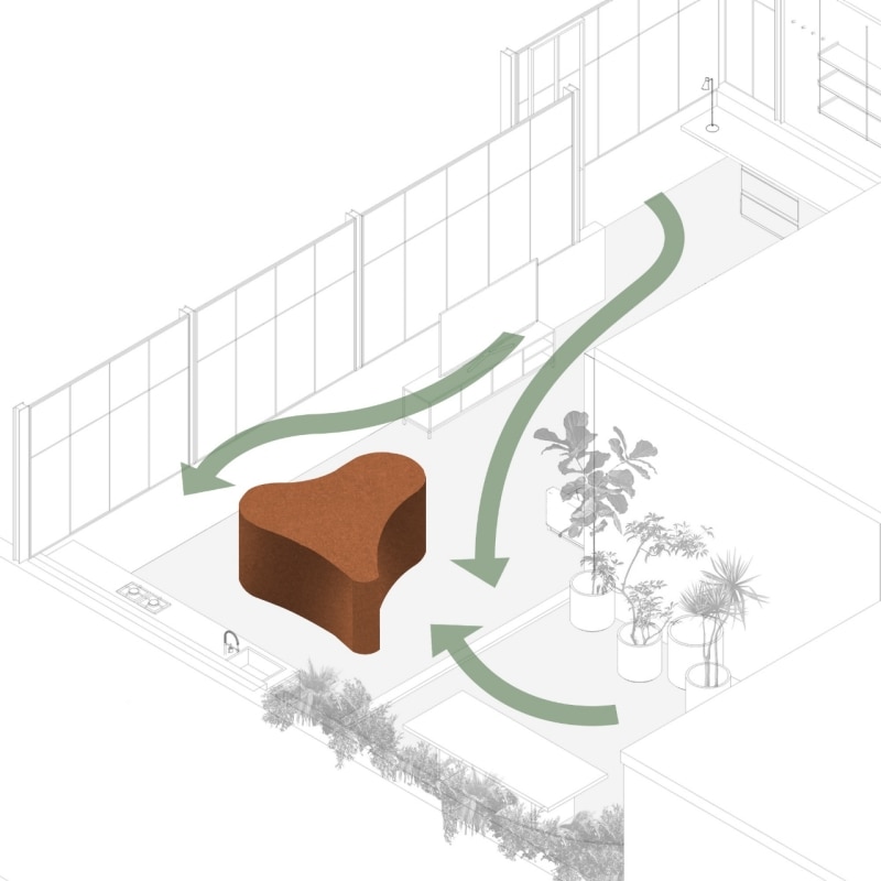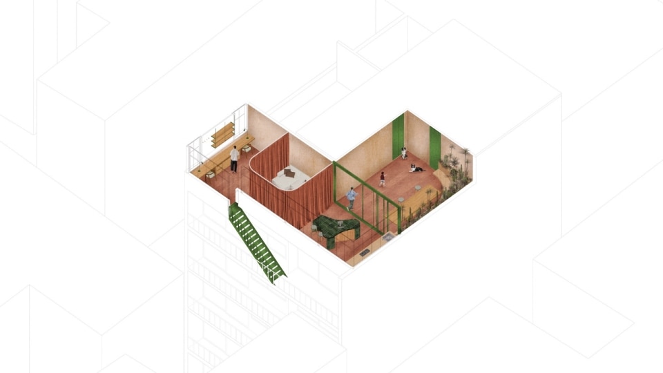 Ed ecco che in aggiunta ai 95 mq di casa in cui concentrare le funzioni convenzionali, compare quello spazio ibrido che i proprietari non avevano ancora ben focalizzato: “Volevano qualcosa di semplice, una copertura per il barbecue, ma dopo i primi incontri abbiamo visto un grande potenziale qui, per creare uno spazio totalmente differente nella città, differente anche dallo stesso appartamento al livello inferiore”.
