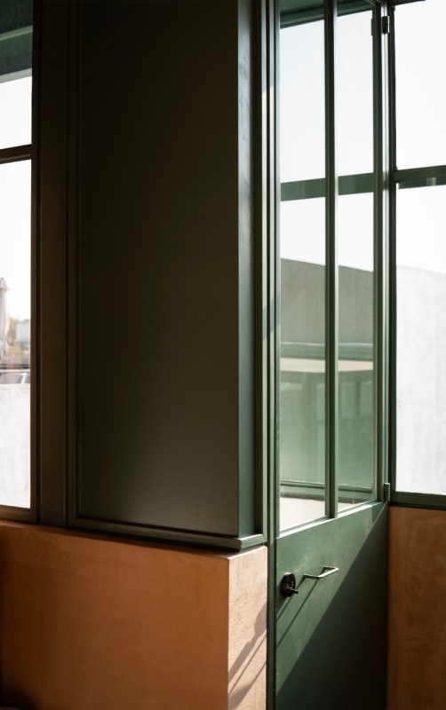 Traguardando le sue vetrate coi loro telai sottili di ferro verde, si potrebbe trovare una traccia di quella Città del Messico che Luca Guadagnino ha provato ad evocare negli interni-modello del suo Queer, senza raggiungerne le esasperazioni chimiche figlie di Burroughs: un cielo urbano che entra dentro muri leggeri, mentre i tetti degli altri edifici generano un tappeto vivo appena sotto.