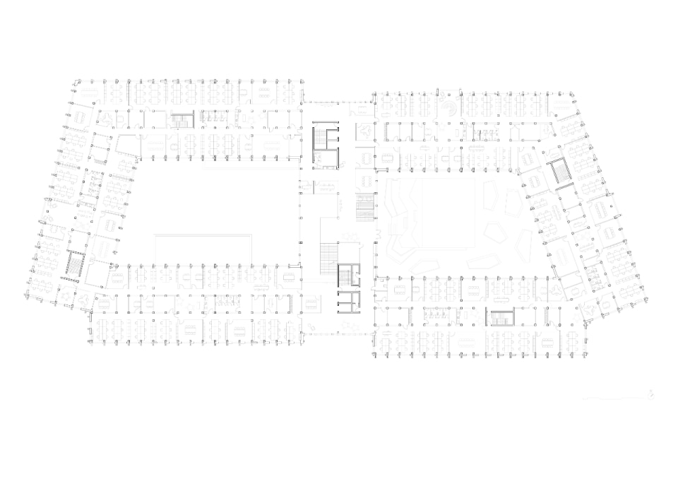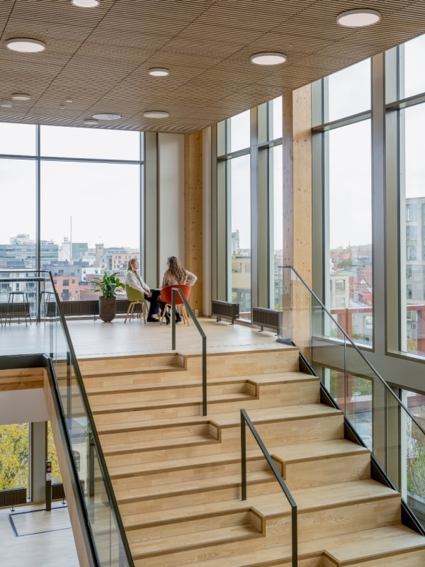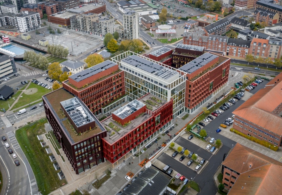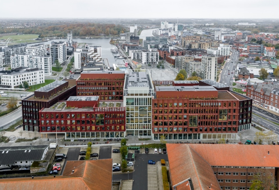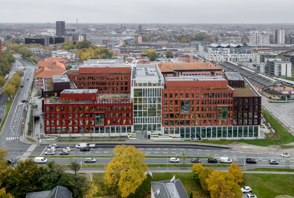 Nel cuore della Danimarca, sull'isola di Fiona, lo studio C.F. Møller Architects firma un progetto pilota che segna un passaggio decisivo nella riflessione sull’edilizia sostenibile a scala urbana, confermando il proprio impegno verso la transizione ecologica. WoodHub è il più grande edificio per uffici della Danimarca con struttura in legno massello, tecnologia che consente una drastica riduzione delle emissioni di carbonio a paragone di tecnologie convenzionali, oltre ad elevate prestazioni tecniche. L’impianto misurato e funzionale è composto da due corpi di uffici sfalsati a forma di C, con piani da tre a sei, raccordati al centro da un blocco di sette piani. Patii e terrazze a verde punteggiano il progetto, con i fronti rivestiti in alluminio riciclato che richiamano cromaticamente gli edifici in mattoni circostanti. Tutto esprime l’understatement tipico dello studio: chiarezza compositiva e semplicità formale, senza rinunciare a calore materico e qualità dello spazio.