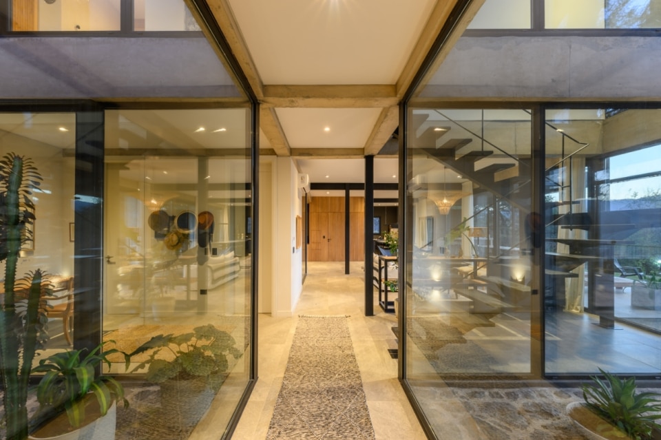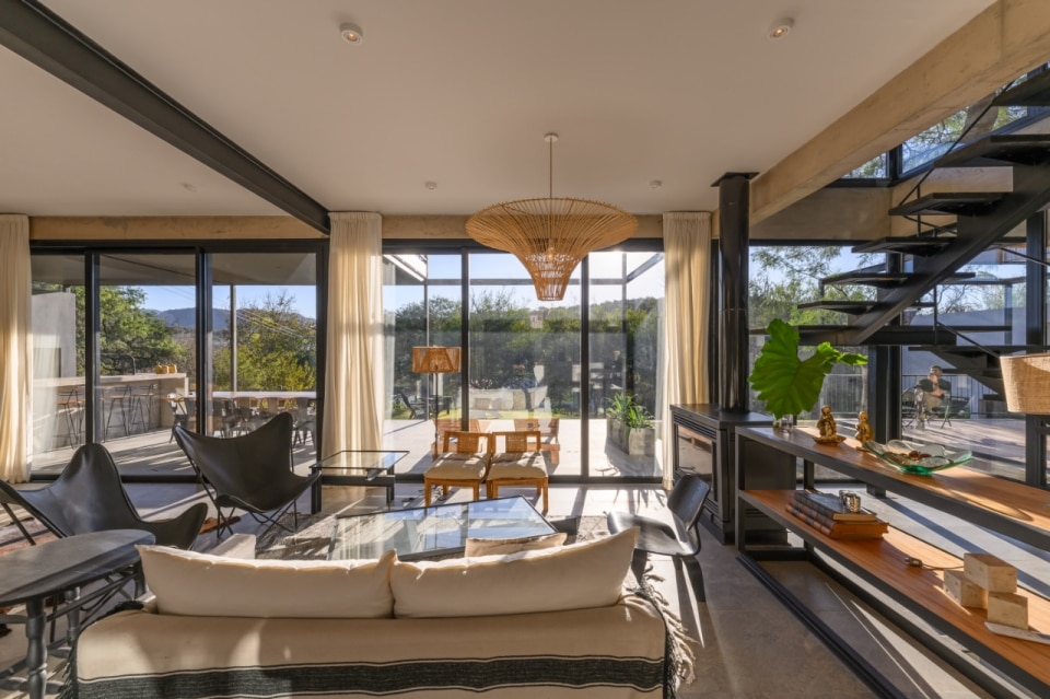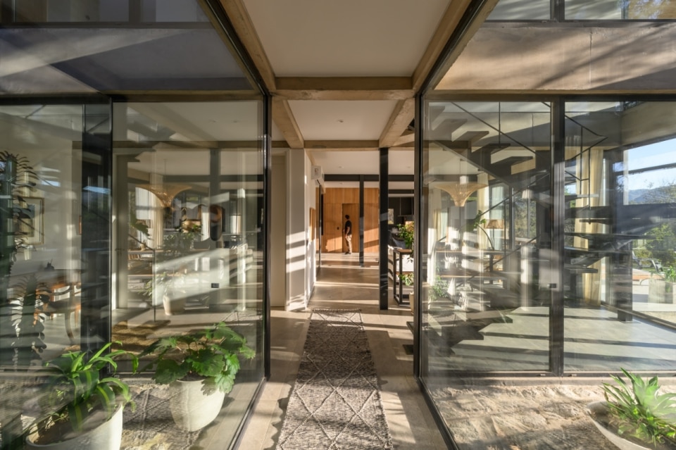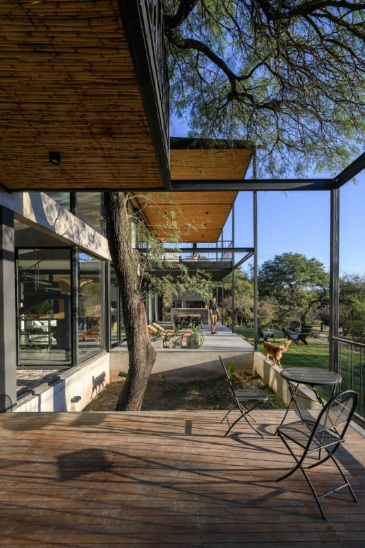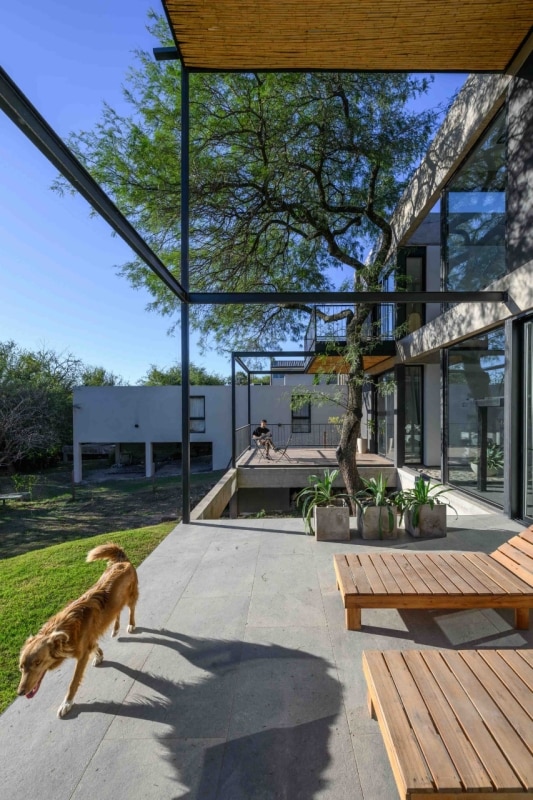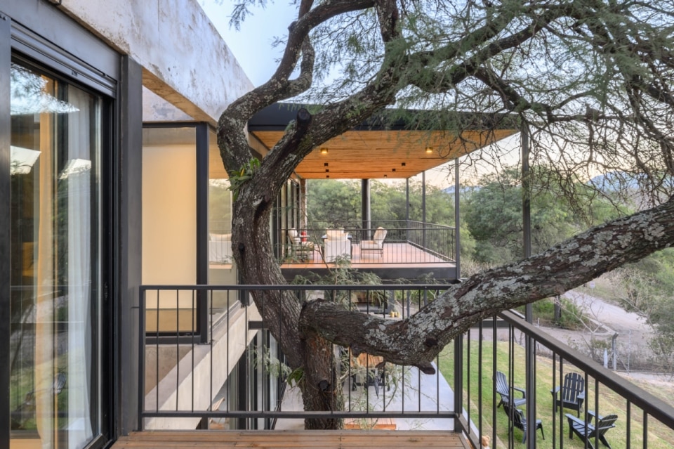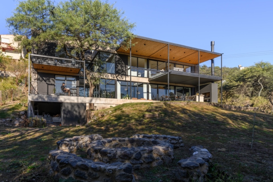 In Argentina, SET arq firma un’abitazione che assume i vincoli esistenti come principi ispiratori di progetto. La casa su due piani, adagiata su un declivio in lieve pendenza ed accessibile dalla quota superiore della strada a sud-est, deve il suo impianto planivolumetrico ai due muri laterali in pietra che marcano i confini nord-est e sud-ovest del lotto e ad un albero di algarrobo che la costruzione ingloba come fulcro naturale della composizione. Attorno a questo, lo spazio si snoda in una sequenza di ambienti ariosi e permeabili, scanditi da partizioni minime e flessibili, e si erode in una trama di patii alberati che intercettano luce e ventilazione naturali, amplificando la continuità visiva con l’esterno. Una palette di materiali naturali rigorosamente a vista (pietra, cemento e metallo), in dialogo con le ampie superfici vetrate della facciata esposta a nord-ovest, denuncia la ricerca di un equilibrio sottile tra rigore costruttivo e leggerezza figurativa.