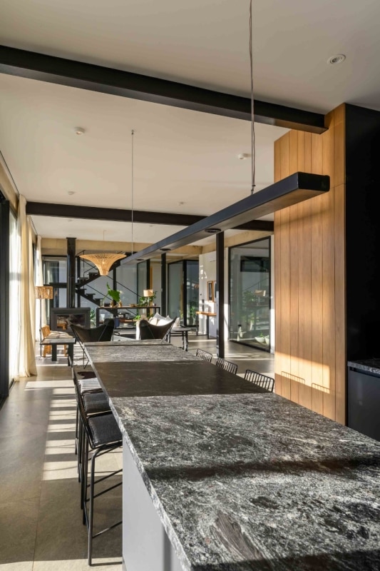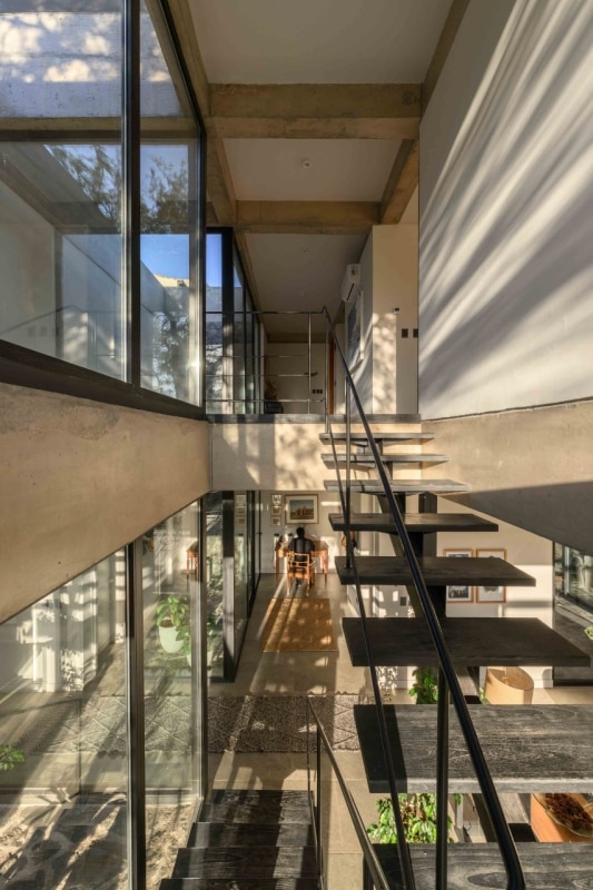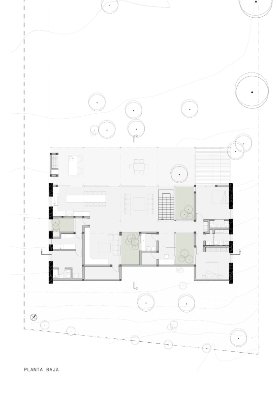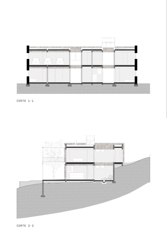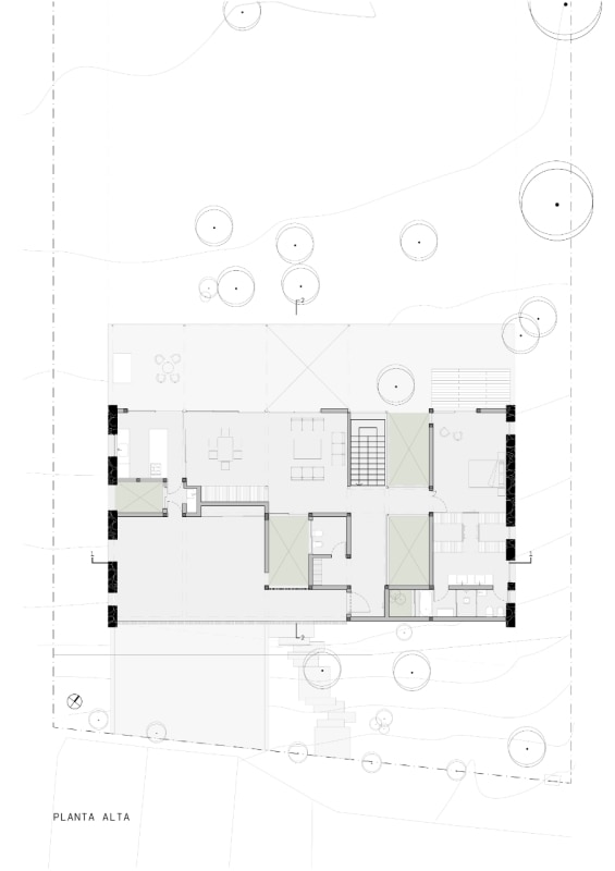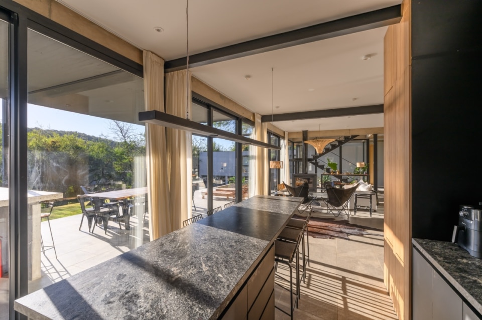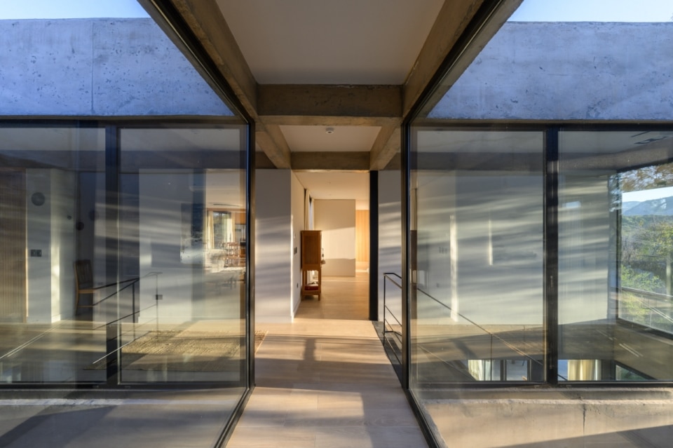 In Argentina, SET arq firma un’abitazione che assume i vincoli esistenti come principi ispiratori di progetto. La casa su due piani, adagiata su un declivio in lieve pendenza ed accessibile dalla quota superiore della strada a sud-est, deve il suo impianto planivolumetrico ai due muri laterali in pietra che marcano i confini nord-est e sud-ovest del lotto e ad un albero di algarrobo che la costruzione ingloba come fulcro naturale della composizione. Attorno a questo, lo spazio si snoda in una sequenza di ambienti ariosi e permeabili, scanditi da partizioni minime e flessibili, e si erode in una trama di patii alberati che intercettano luce e ventilazione naturali, amplificando la continuità visiva con l’esterno. Una palette di materiali naturali rigorosamente a vista (pietra, cemento e metallo), in dialogo con le ampie superfici vetrate della facciata esposta a nord-ovest, denuncia la ricerca di un equilibrio sottile tra rigore costruttivo e leggerezza figurativa.