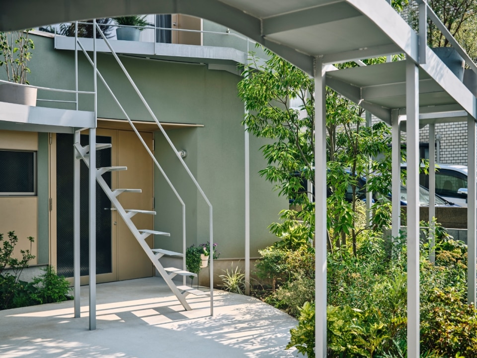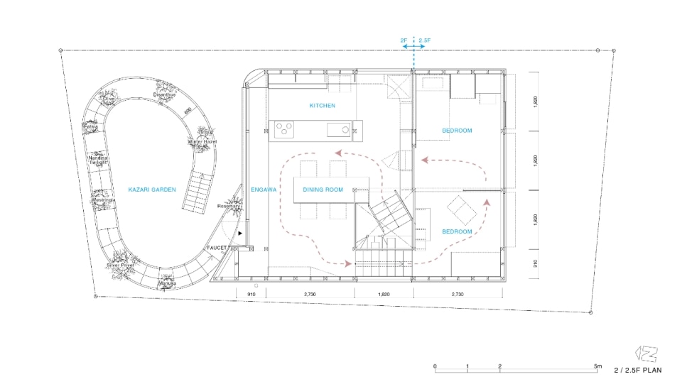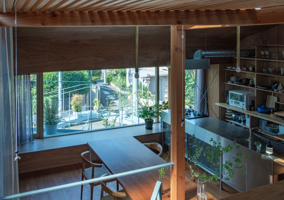 Occupa un lotto in un quartiere densamente edificato di Tokyo la casa-studio che Hiroyuki Oinuma (studio Hoaa) ha progettato per sé. Inserita in una fitta rete di costruzioni, l’unico affaccio aperto sulla strada, anziché verso altri edifici a distanza ravvicinata, è a nord: un’esposizione generalmente penalizzante, che qui diventa occasione progettuale. La facciata principale è infatti schermata da un percorso rialzato e curvilineo, il “Kazari Garden”, un giardino in vaso che da una parte separa la casa dalla strada, dall’altra la connette, innescando una relazione visiva e sociale con lo spazio pubblico e incoraggiando interazioni spontanee con i passanti. All’interno, il suo tracciato prosegue in una sequenza di ambienti organizzati su livelli sfalsati che assecondano la differenza di quota del sito. Gli spazi si susseguono in un passaggio continuo, segnato da scale, corrimano e arredi su misura, come se fosse riproposto il percorso esterno anche all'interno.
