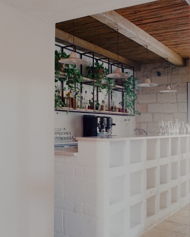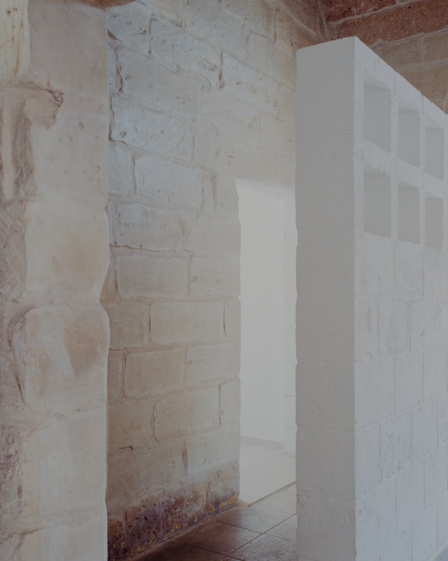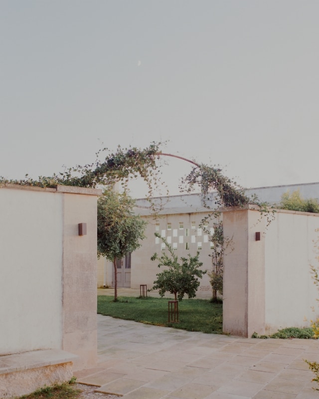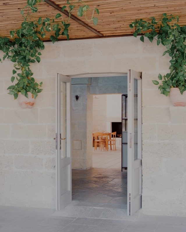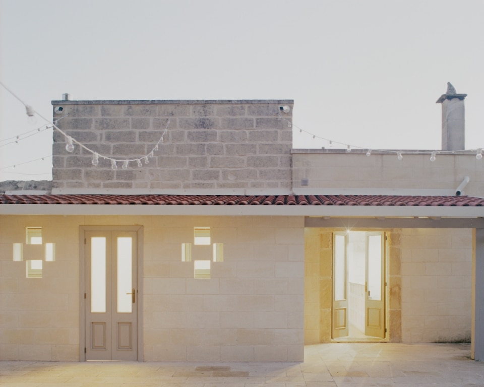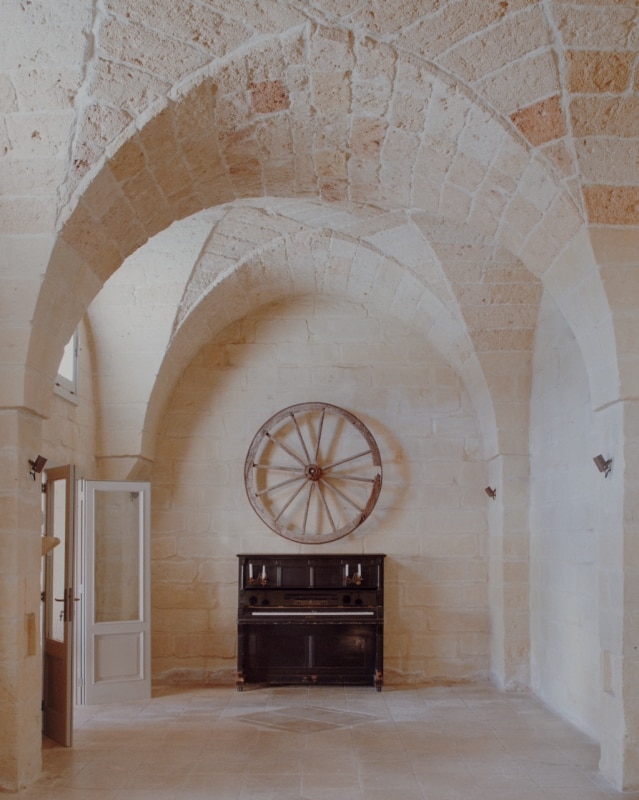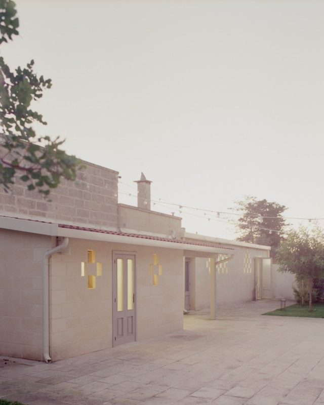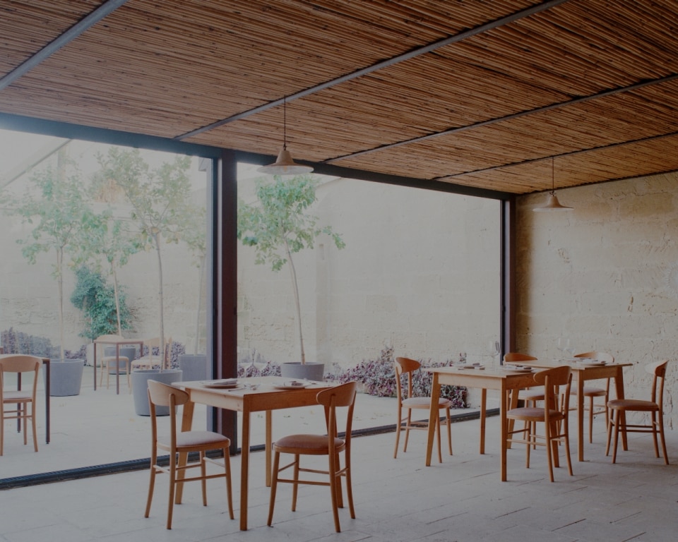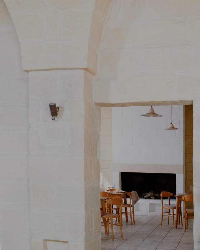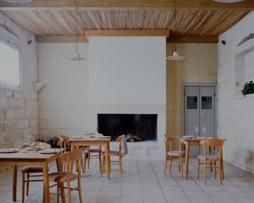 Tra gli uliveti della campagna salentina, lo studio Margine ha restaurato e riconvertito a ristorante un’antica dimora rurale dove un tempo si allevavano ovini per la produzione di lana e filati, riportandone alla luce il fascino ruvido di “opificio” e restituendo chiarezza all’impianto primitivo. Il nucleo originario è un volume in pietra leccese con tre stanze a copertura a volta, affacciato su un cortile quadrangolare recintato, a cui nel tempo si sono aggiunte diverse superfetazioni. Rileggendo attentamente il contesto e le sue stratificazioni, i progettisti hanno lavorato per sottrazione. Con la rimozione selettiva delle finiture e delle coperture posticce, e al “camouflage” di strutture incongrue, gli involucri lapidei originali sono stati recuperati e gli interni riorganizzati attorno a tre elementi ex novo: il bancone di ingresso, il focolare e una quinta a schermatura dell’antibagno. Questi tre dispositivi sono realizzati in tufo e scialbati con latte di calce per evidenziare l'intervento contemporaneo rispetto all'antica struttura.