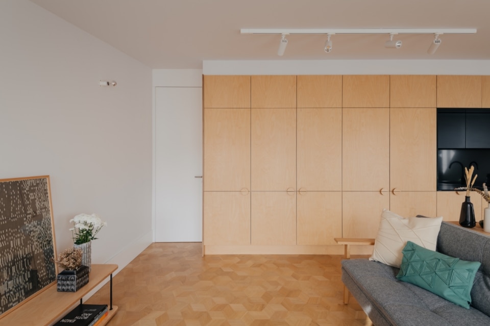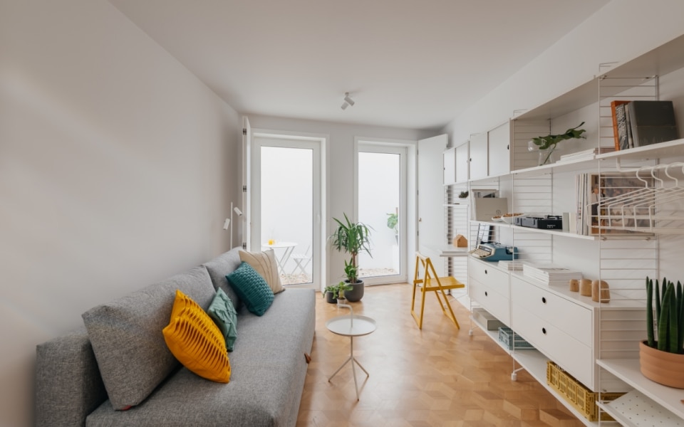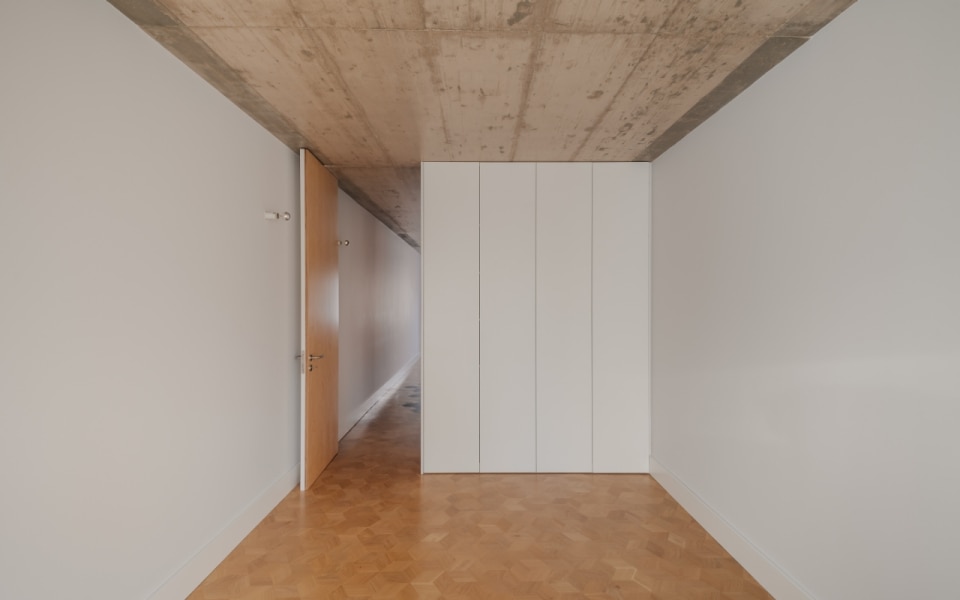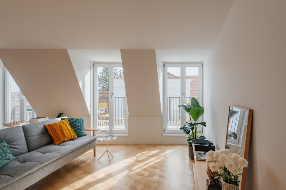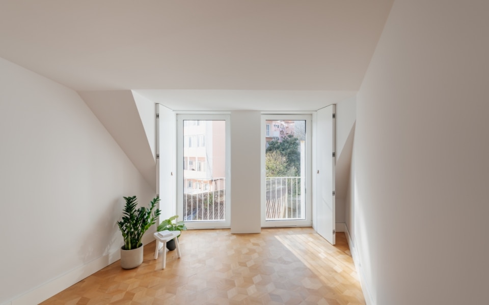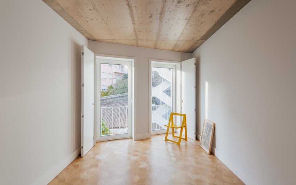 Lapa è un quartiere di Lisbona in continua trasformazione, e in questo contesto, l'edificio residenziale di Ala.rquitectos restituisce alla città dieci unità abitative compatte, pensate per una o due persone. È attraverso i materiali che il progetto costruisce la propria identità: la facciata principale si ricopre di mattonelle ceramiche artigianali color grigio chiaro, una soluzione tipicamente portoghese, mentre le lavorazioni in pietra, le soglie e le ringhiere in ferro battuto originali vengono recuperate e reintegrate. Le aperture, a doppia anta in legno laccato, giocano su due toni: il grigio scuro per la parte fissa, il bianco per quella mobile. Sul prospetto posteriore, l'intonaco bianco e i serramenti in alluminio alleggeriscono il registro cromatico, in un equilibrio misurato. Anche gli interni si caratterizzano attraverso una palette materica contemporanea e calda. Le pareti sono bianche, accostate ad alcuni elementi in cemento e un pavimento che è l'unico vero elemento decorativo: uno schema esagonale che alterna legno e mattonelle nelle zone umide, creando un sottile effetto optical.