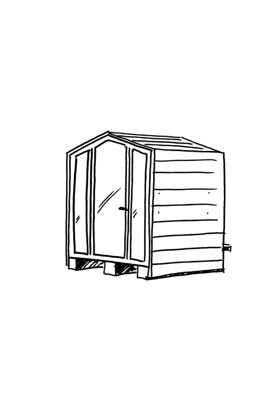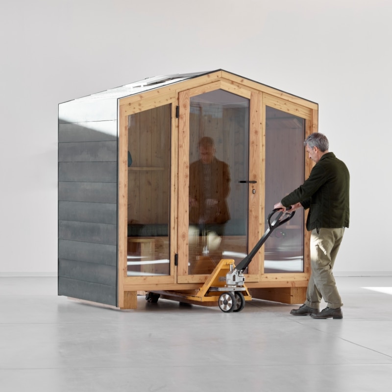 Il risultato è un modulo compatto e trasportabile, che riprende le logiche costruttive di un “flying office” pensato per spazi interni flessibili che il designer aveva progettato nel 2004. “Mi interessava immaginare un posto letto movimentabile come un pallet”, racconta Damiani, “ma allo stesso tempo volevo che questo oggetto trasmettesse un’idea di casa riconoscibile”. Da qui il tetto a falda, archetipico e immediato.