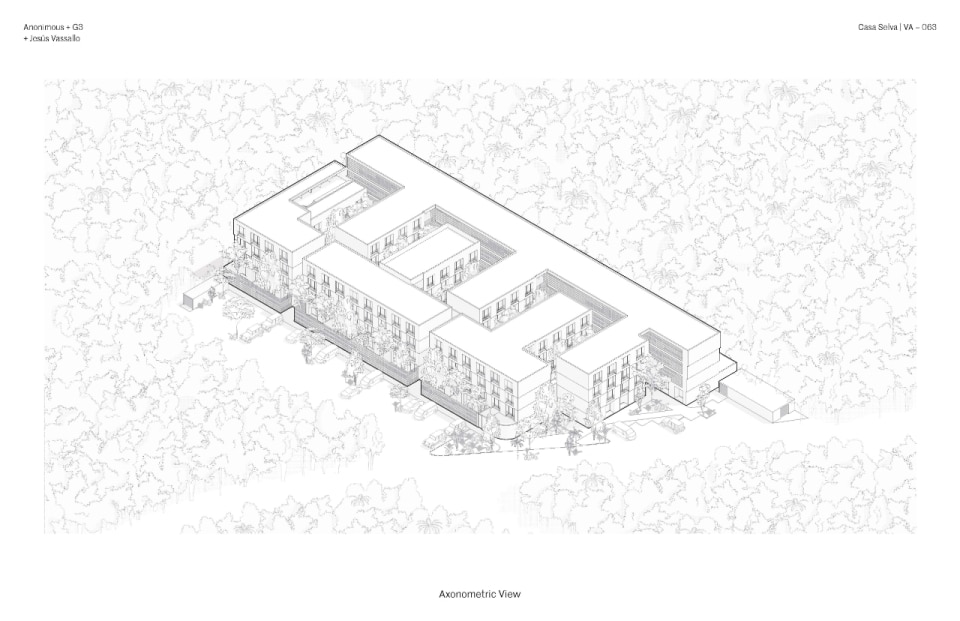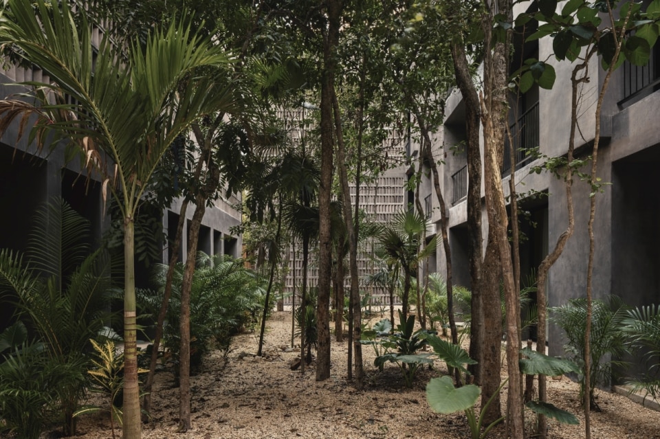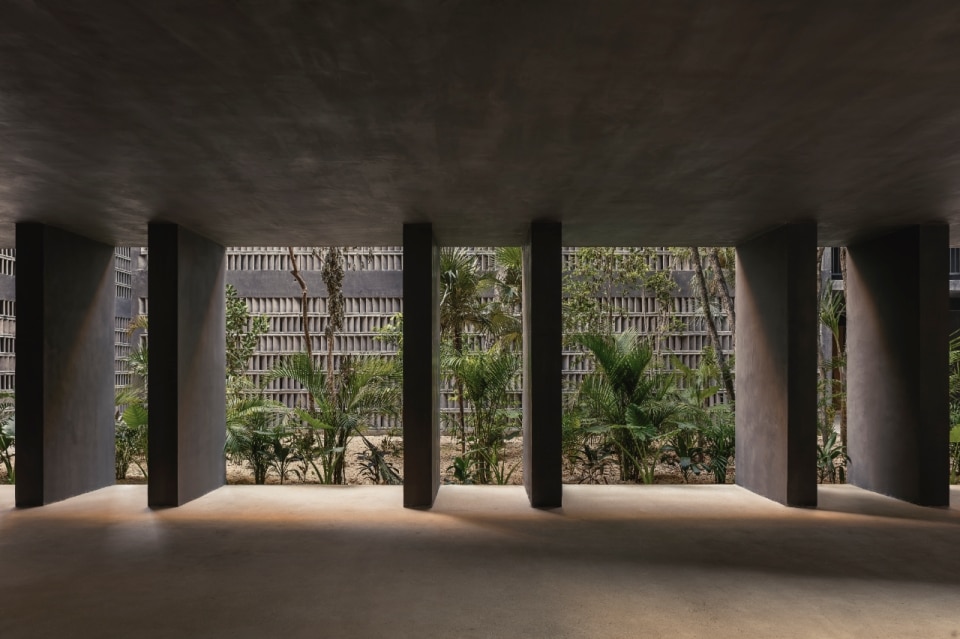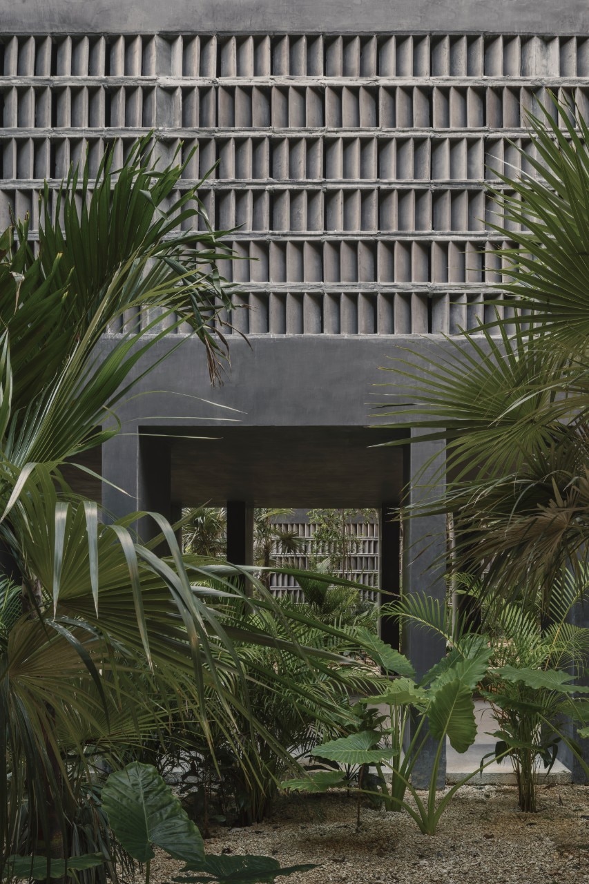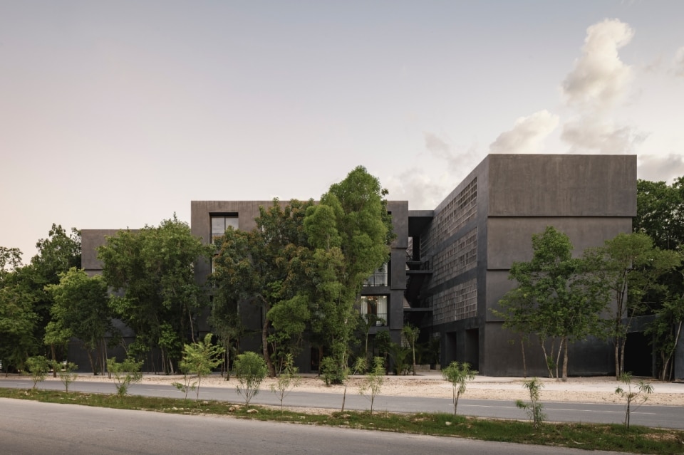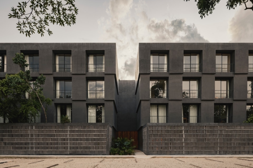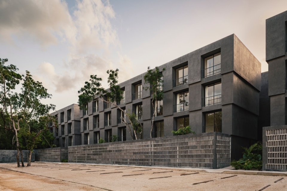 Ai margini di Tulum, una meta turistica messicana molto ambita, Anonimous + G3 + Jesús Vassallo hanno progettato un complesso residenziale ad alta densità che integra intensità espressiva e qualità spaziale. I volumi scarni e rigorosi in cemento scuro evocano il romanticismo di un paesaggio ancestrale immerso nella foresta, e la composta monumentalità di un brutalismo delle origini. L’intervento comprende 200 alloggi a prezzi accessibili per il personale che lavora nella locale industria del turismo e della ristorazione, e presenta un impianto rigoroso e compatto che ibrida il blocco a corte con la tipologia lineare. Gli edifici di quattro piani si intrecciano in una configurazione a pettine e sono intervallati da una rete di cortili punteggiati da vegetazione tropicale, connessi tra loro da percorsi pedonali e spazi pubblici. Lungo i corridoi comuni, schermature frangisole - evocative del tradizionale cobogò sudamericano - rendono porosa la massa costruita, e la arricchiscono di drammatici giochi chiaroscurali. Ai piani, gli alloggi semplici e funzionali godono di affacci opposti, a beneficio di generosa illuminazione naturale, ventilazione incrociata e interazioni continue con il paesaggio vegetale.