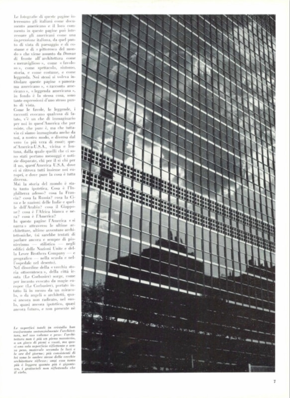 Dopo i lanci di edifici a massima trasparenza come l’Equitable Building che Pietro Belluschi completa nel 1948 a Portland, in Oregon, un altro epicentro del costruire in verticale cambia la propria immagine e lo fa massivamente: New York, specificamente Midtown Manhattan. Nasce l’archetipo, l’eponimo, proprio al volgere degli anni ’50: il Palazzo di Vetro, il quartier generale delle Nazioni Unite, progetto dove sotto la direzione di Wallace K. Harrison lavoreranno architetti come Le Corbusier e Oscar Niemeyer, offre al fronte dell’East River una facciata alta più di 150 metri, dove il vetro verde-azzurro unisce città e paesaggio nel messaggio simbolico, di una nuova trasparenza.
