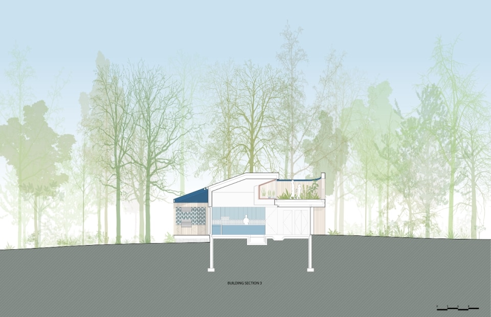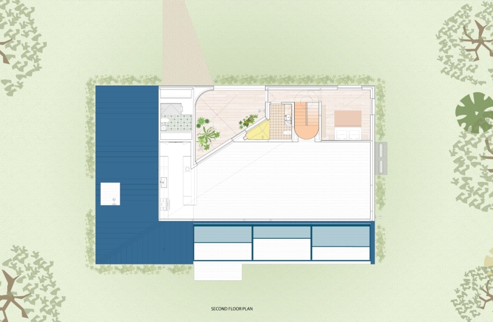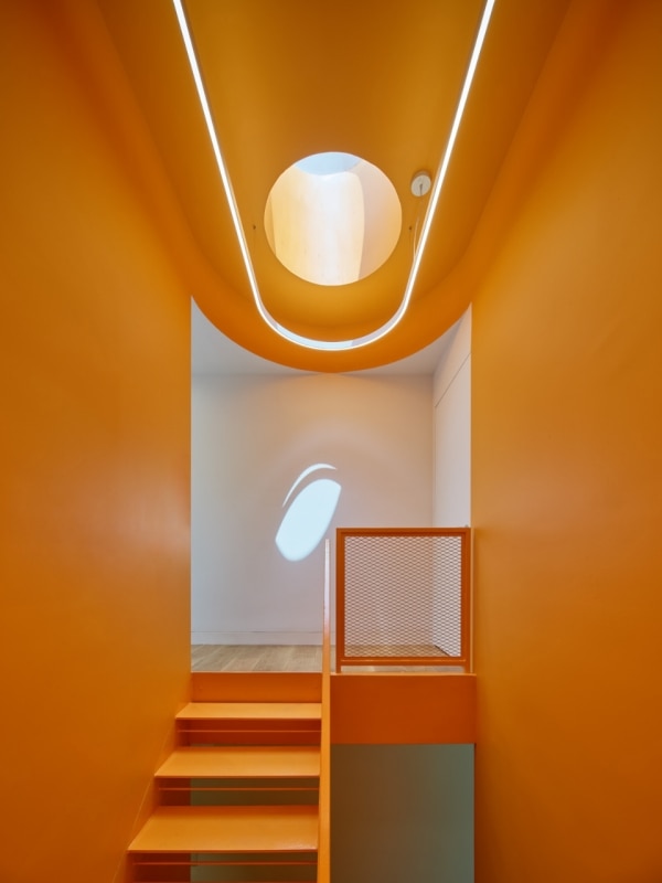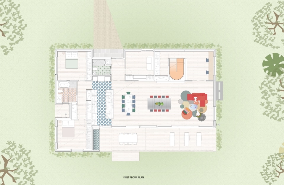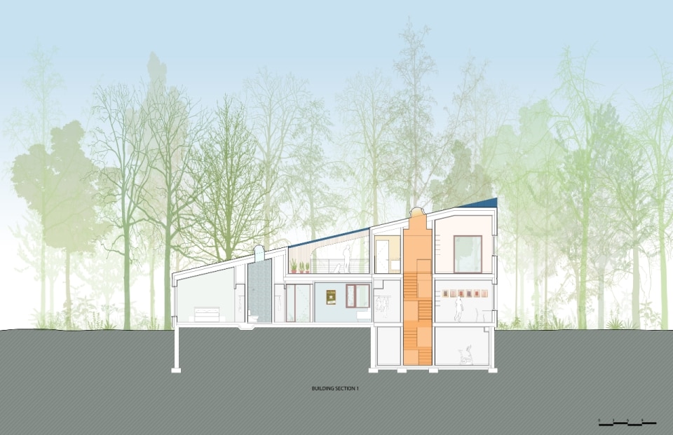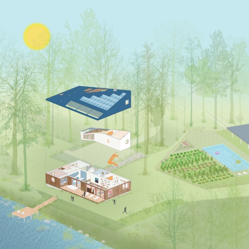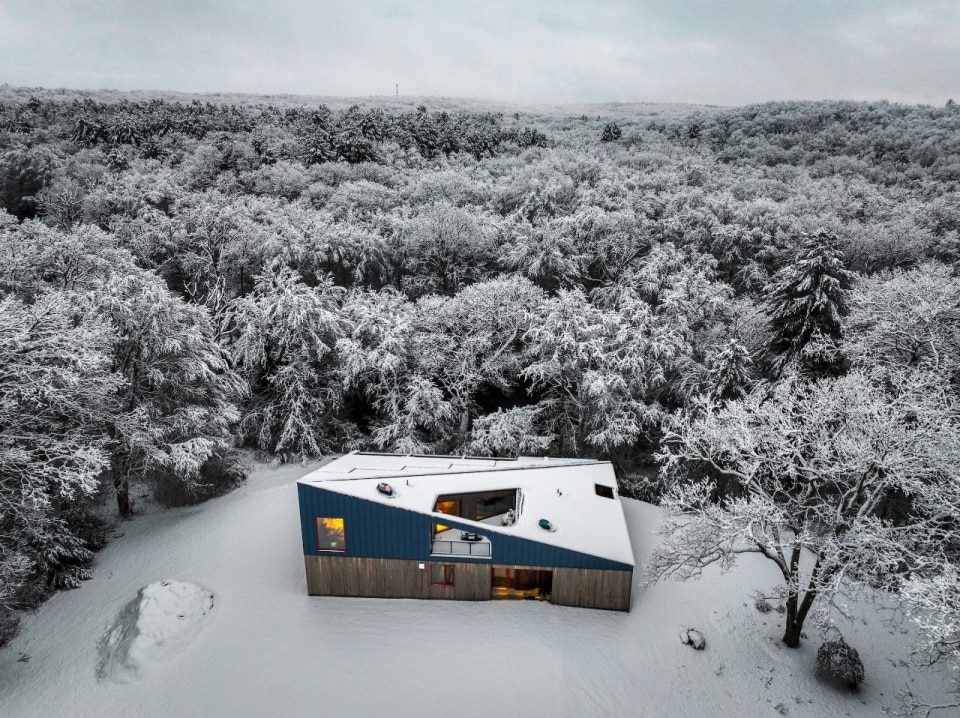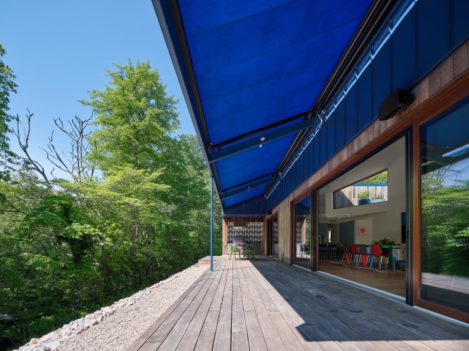 Progettata da Amale Andraos e Dan Wood - fondatori di Workac - per la propria famiglia, la casa nel paesaggio rurale del Rhode Island nasce come rifugio durante la pandemia e diventa abitazione permanente, proponendo un modello abitativo sostenibile e collaborativo che amplia il concetto stesso di “famiglia”. Al posto di una costruzione obsoleta, per anni luogo informale di sessioni di brainstorming culturali e convivialità con amici e colleghi, la coppia di architetti ha ideato un edificio passivo a zero emissioni che conserva lo spirito informale e vivace delle origini. Il volume compatto e sfaccettato, rivestito in frassino locale e sovrastato da una copertura in alluminio blu, si schiude all’interno in una sequenza fluida di spazi: altezze variabili e scorci studiati compongono un’idea di domesticità avvolgente. Il progetto si estende al processo: amici e collaboratori hanno contribuito direttamente alla definizione di ambienti e arredi — talvolta accampandosi nel lotto e pescando nel fiume vicino, spiegano gli architetti. Dal tavolo del soggiorno, agli scenografici tendaggi, alle piastrelle artigianali libanesi, il risultato è una casa vissuta e “partecipata”, per quelli che la abitano o che la attraversano anche solo temporaneamente.