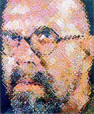 Una tecnica artistica personalissima che subisce una svolta decisiva nel 1988, quando, a 48 anni, l’artista viene colpito da una malattia che lo lascia semi-paralizzato: Close si inventa un arnese che gli permette di dipingere, legando il pennello all’avambraccio. Per realizzare le sue teste, l’autore scatta molte foto dello stesso soggetto, scompone ogni immagine sulla tela per mezzo di reticoli, ingrandisce le dimensioni per ottenere particolari nitidi, quasi maniacali: riesce così a dare ai dipinti quasi la sensazione di un’immagine digitale. Da moltissimi anni Close lavora con Pace-Wildenstein Gallery e un suo ritratto viene venduto fino a due miliardi di lire. Le sue opere fanno parte delle collezioni dei musei più prestigiosi.