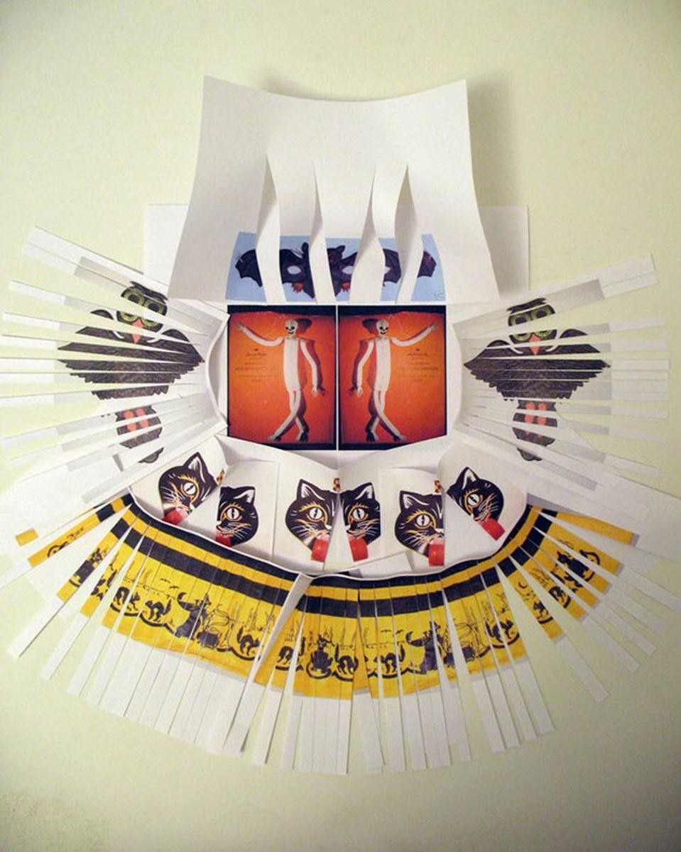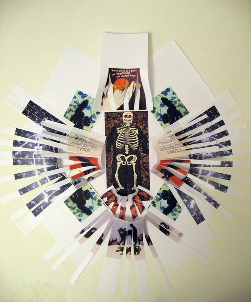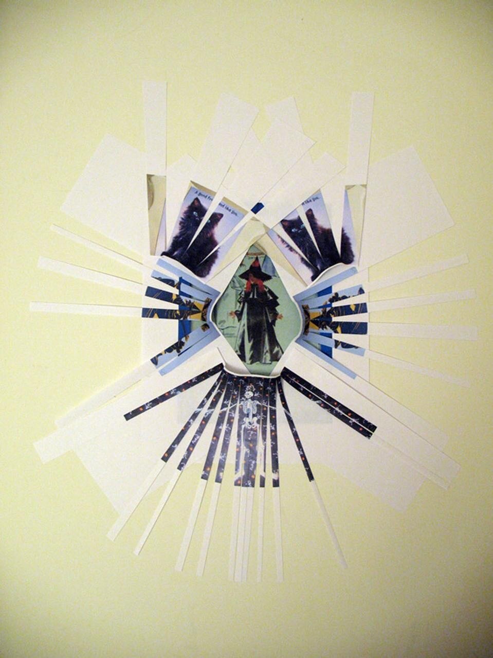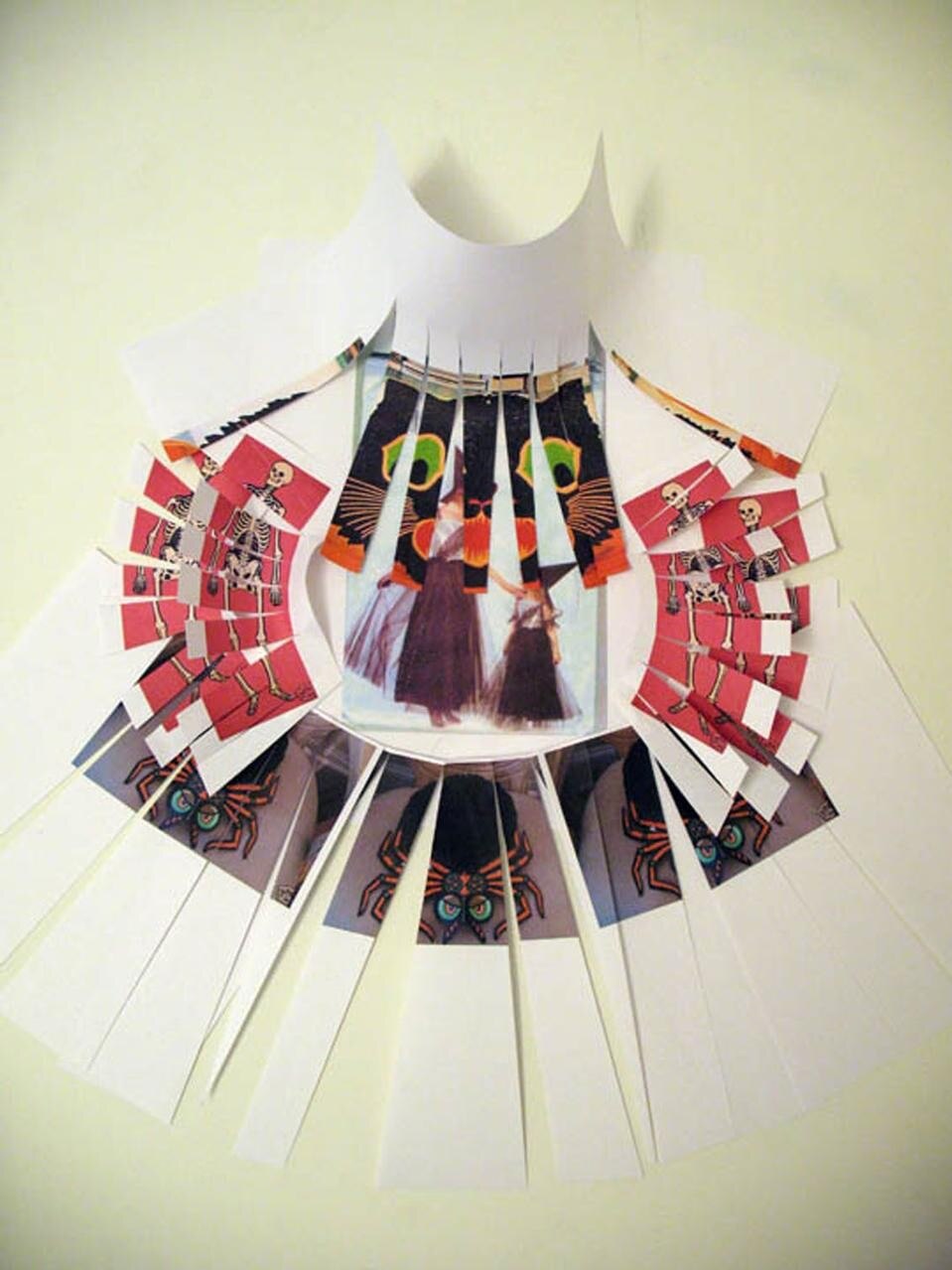 Rachel_Ho cominciato a usare il collage quale alternativa al disegno a matita per rappresentare realtà più confuse e sovrapposte. Ho preso costumi e decorazioni tradizionali di Halloween e ho cominciato a riorganizzarli in modo visivamente piacevole ma anche disordinato nella sua forma, per parlare di esperienza umana, dove passato e presente si confondono nelle nostre menti.