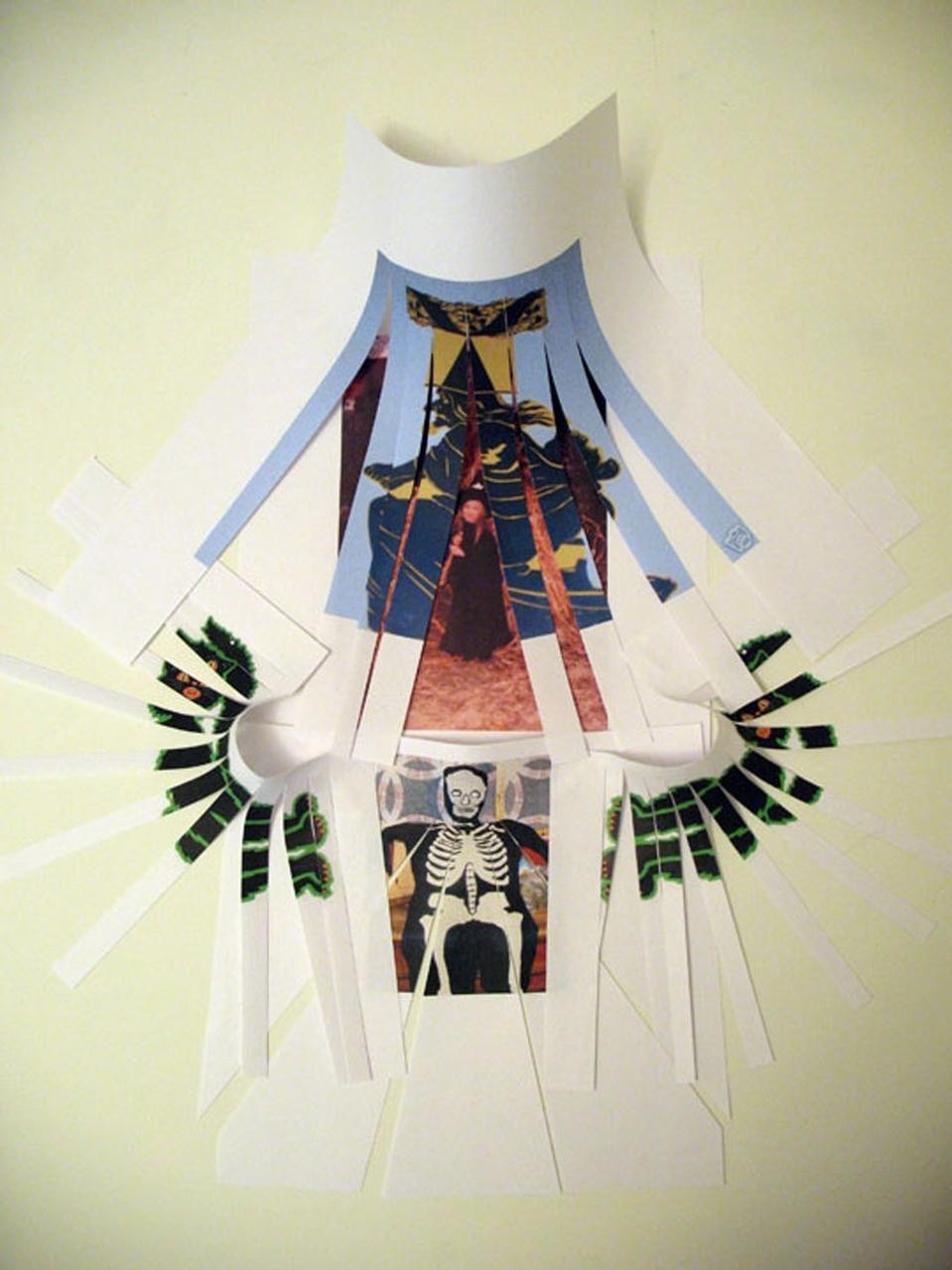 Vorrei insistere su questo fatto della composizione – come sono rimessi insieme i pezzi una volta rotti i legami con i significati legati al contesto – perché il tuo collage, ancora più della maschera tribale, rimanda all'idea del mandala. Naturalmente il mandala ha molti significati, contiene l'idea di essere "un microcosmo che rappresenta i poteri divini in opera nell'universo" e via discorrendo. Però il mandala può essere letto come immagine della psiche. Jung, per esempio, ne ha parlato in termini di "rappresentazione del sé inconscio". A me personalmente ha colpito leggere che Jung avesse notato come l'ordine severo imposto da un'immagine circolare potesse essere in grado di compensare – attraverso la costruzione di un punto centrale al quale ogni cosa è correlata, – il disordine e la confusione dello stato psichico: quasi che l'immagine stessa avesse un potere terapeutico.