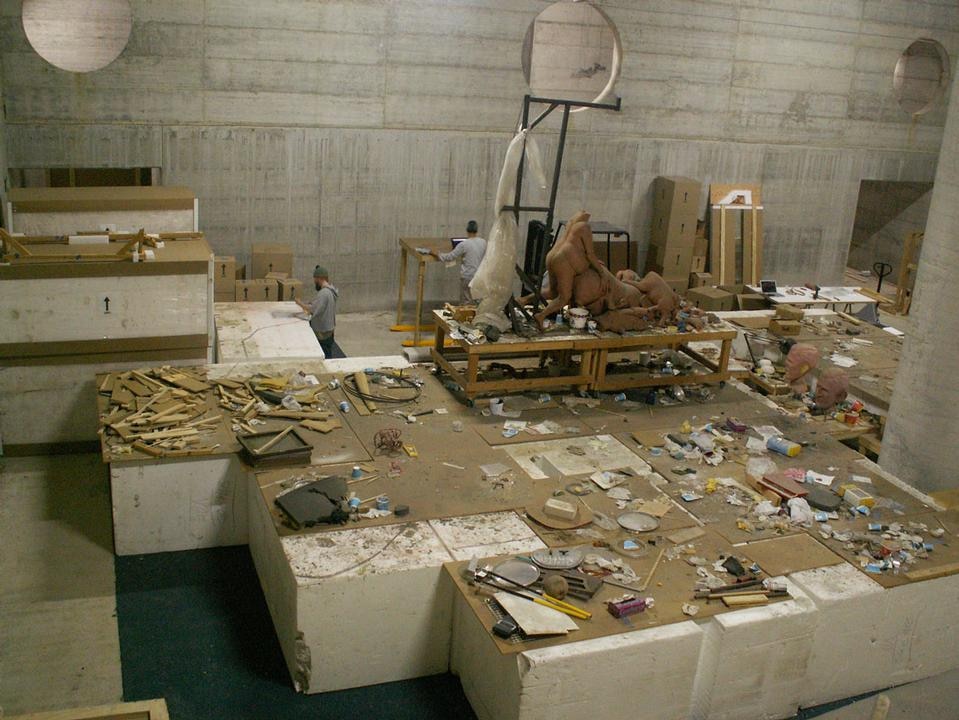 "Cercavamo qualcuno che fosse in grado di riempire e reggere il dialogo con uno spazio di dimensioni tanto imponenti", continua il curatore. E, addentrandosi nelle viscere del palazzo, si scopre perché. Superate una decina tra installazioni video e sculture di grandi dimensioni, "maschere" iper-realistiche in silicone colorato incuranti delle tubazioni a vista che passano attraverso i muri in cemento, si arriva al cuore del percorso, l'immensa Pig Island annunciata fin dall'ingresso. È la prima volta che la scultura lascia lo studio di Los Angeles. Trasportata a Milano in diversi container, poi calati all'interno del palazzo attraverso un lucernario del cortile scoperchiato, è stata smontata e poi rimontata tale e quale, in modo assolutamente maniacale. "Perfino la polvere", precisa il curatore, "è stata rimessa esattamente dov'era". Su una decina di piedestalli di polistirolo c'è spazio per Bush e Angelina Jolie, un grande maiale (che sembra respirare e si muove) e una batteria, oltre a scatolette, lattine e confezioni vuote disseminate ovunque, in una sorta di disordinato e dissacrante after party del mito americano.