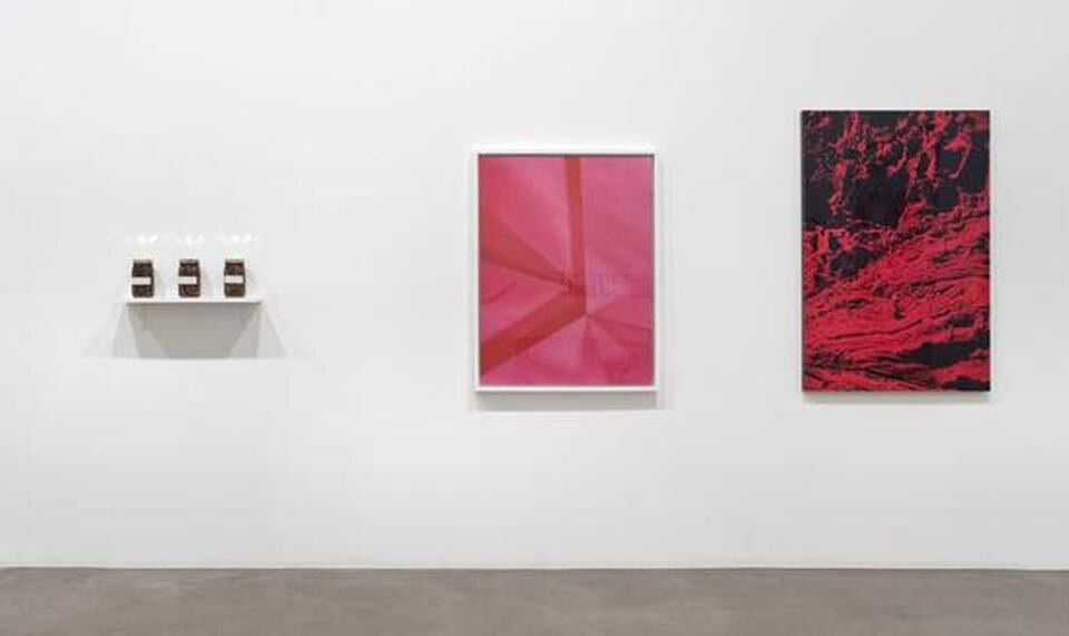 Le opere bidimensionali in mostra sono per forza di cose più astratte. Accoppiate in entrambi gli spazi, le fotografie di Josephine Pryde e di Eileen Quinlan sfruttano le figure idiomatiche filmiche del primo piano e del campo lungo facendole implodere insieme. Il versante tormentato di una collina, fotografato dalla Pryde con il grandangolare e virato in magenta, è collocato accanto a un ritratto a sfumature rosa della Quinlan, realizzato in studio e fatto di schiume, specchi e luci riflesse. Questa dicotomia esterno/interno si riverbera nelle versioni in bianco e nero. Frammenti di pizzo e di tulle creano elusive trame nelle ombre da fotogramma di Everything Moves, Everything Shimmers ("Tutto si muove, tutto è un barlume") della Quinlan; mentre A year Ago Today ("Esattamente un anno fa") è un microcosmo lunare di buchi neri e pietre sgretolate.