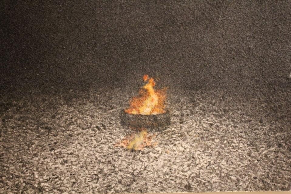 Nella sala accanto, grandi tele portano simbolicamente tra i visitatori le fiamme e le nuvole di fumo di incendi sviluppatisi tra i boschi, realizzati con un "fuoco controllato" ricreato dall'artista sulla tela. Questo tema passa dalla dimensione bidimensionale delle tele a quella tridimensionale della scultura al piano inferiore della galleria, dove si simulano le nubi nere di pneumatici in fiamme, riprodotte utilizzando la fibra d'acciaio.