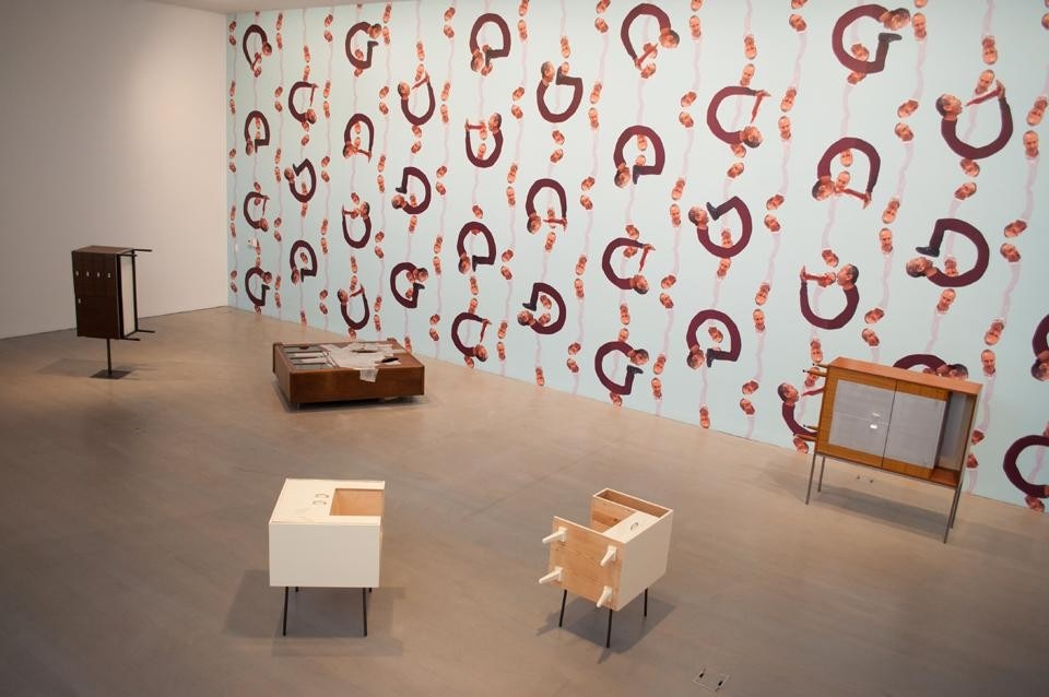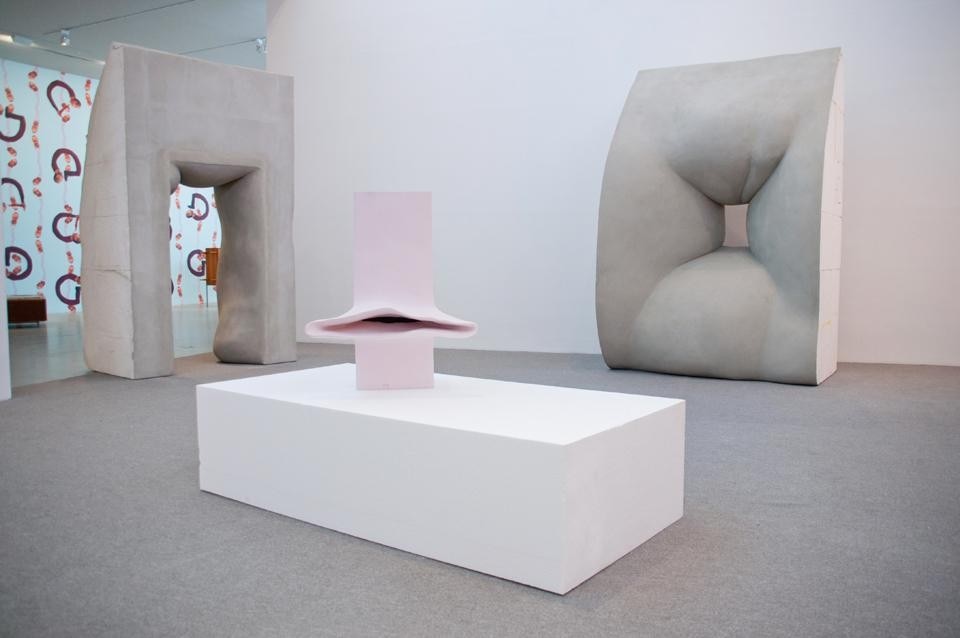 Wurm tende maglioni di lana su fredde pareti bianche: Knitted Wall II (Metal Pink) e Knitted Wall (Mental Purple). E le sculture intitolate The bob (Il cenno: grandi suggerimenti di polistirolo e vernice, alti da due metri a tre metri, che si pigiano in una sala come estranei su una pista da ballo) invitano la fantasia a raggomitolarsi su se stessa o nell'ombelico (o peggio) di un nudo rubensiano per un riposino ristoratore.