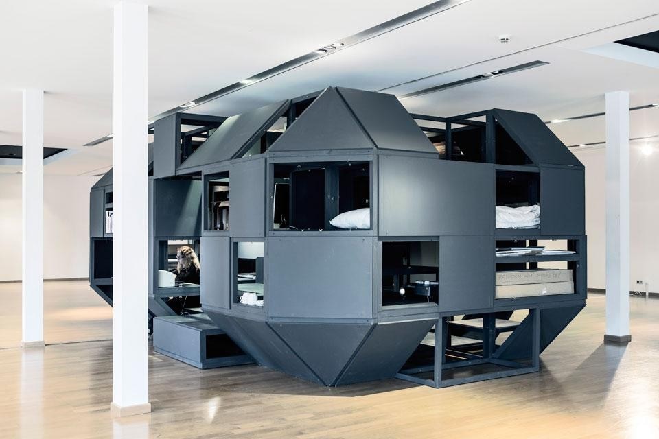 Poiché ogni particella elementare, o blocco costruttivo, deve essere in grado di svolgere più compiti contemporaneamente – cioè deve poter diventare qualunque cosa: scaffale, scrivania, panca, scala e perfino letto – e deve poter funzionare nello spazio della galleria e poter essere trasportata al piano superiore, abbiamo dedicato parecchio tempo ad analizzare vari sistemi che fossero abbastanza aperti e adattabili per raggiungere lo scopo. Un'altra questione importante è ovviamente il fatto che la Verbandkammer è anche pensata per cambiare concretamente il modo di lavorare del FLACC. In una certa misura la sua fisicità produrrà ovviamente un cambiamento, ma il cambiamento vero non avverrà se non si ripensano anche i protocolli d'uso. Anche su questo stiamo lavorando insieme con il FLACC.